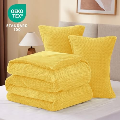 Fluffy Full Comforter Set - Furry Leaves Pattern Faux Fur Full 82X86 Yellow