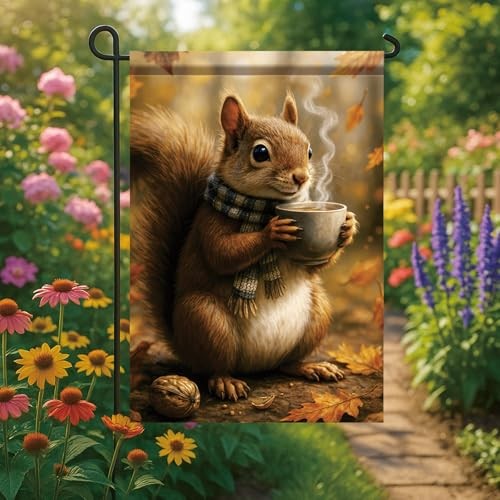 Thanksgiving Fall Garden Flag Flag 12x18 Inch Double-Sided Squirrel Holding Mug