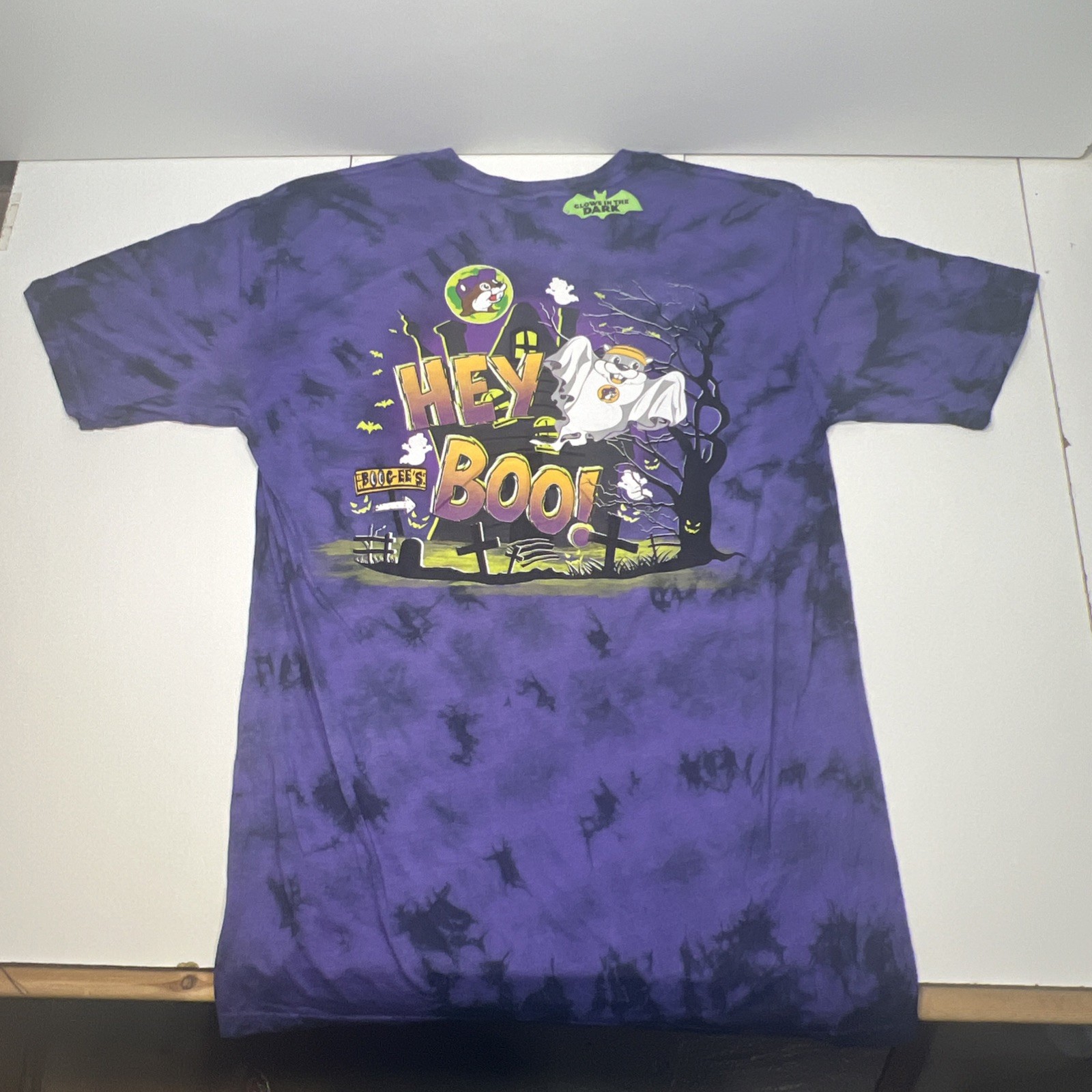 NWT Buc-ees 2024 Halloween Lmtd Ed Glow in Dark Purple Tie-Dye Shirt L Hey Boo