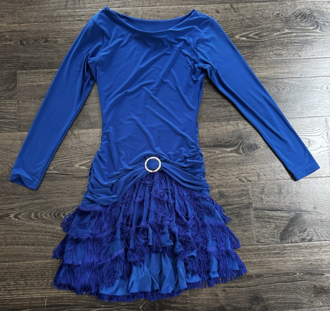 DANCE AMERICA Latin Ballroom Dress Blue Fringe Ruffle Salsa Tango Size S USA