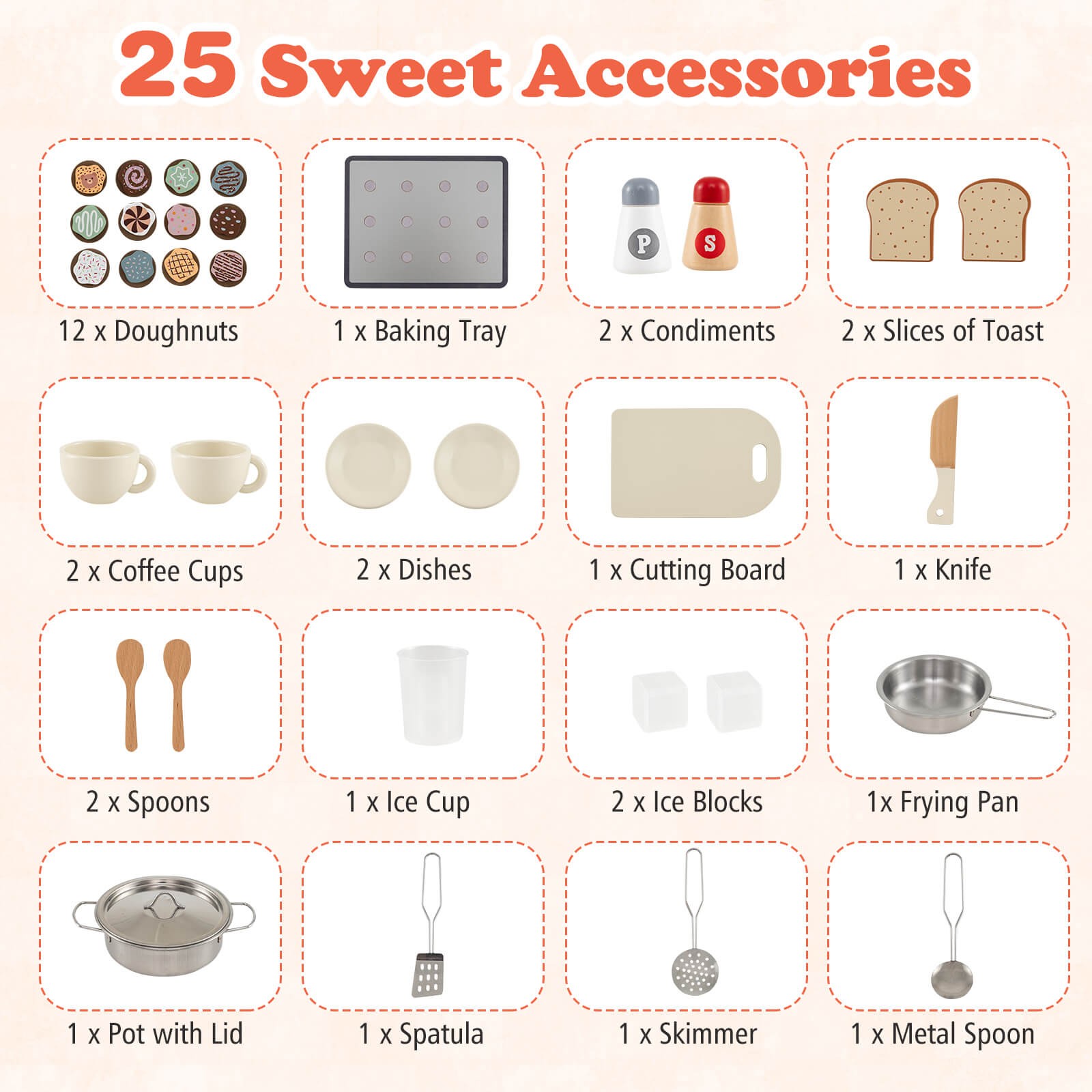 Set Includes: 1 x Play Kitchen, 12 x Doughnuts, 1 x Baking Tray, 2 x Condiments