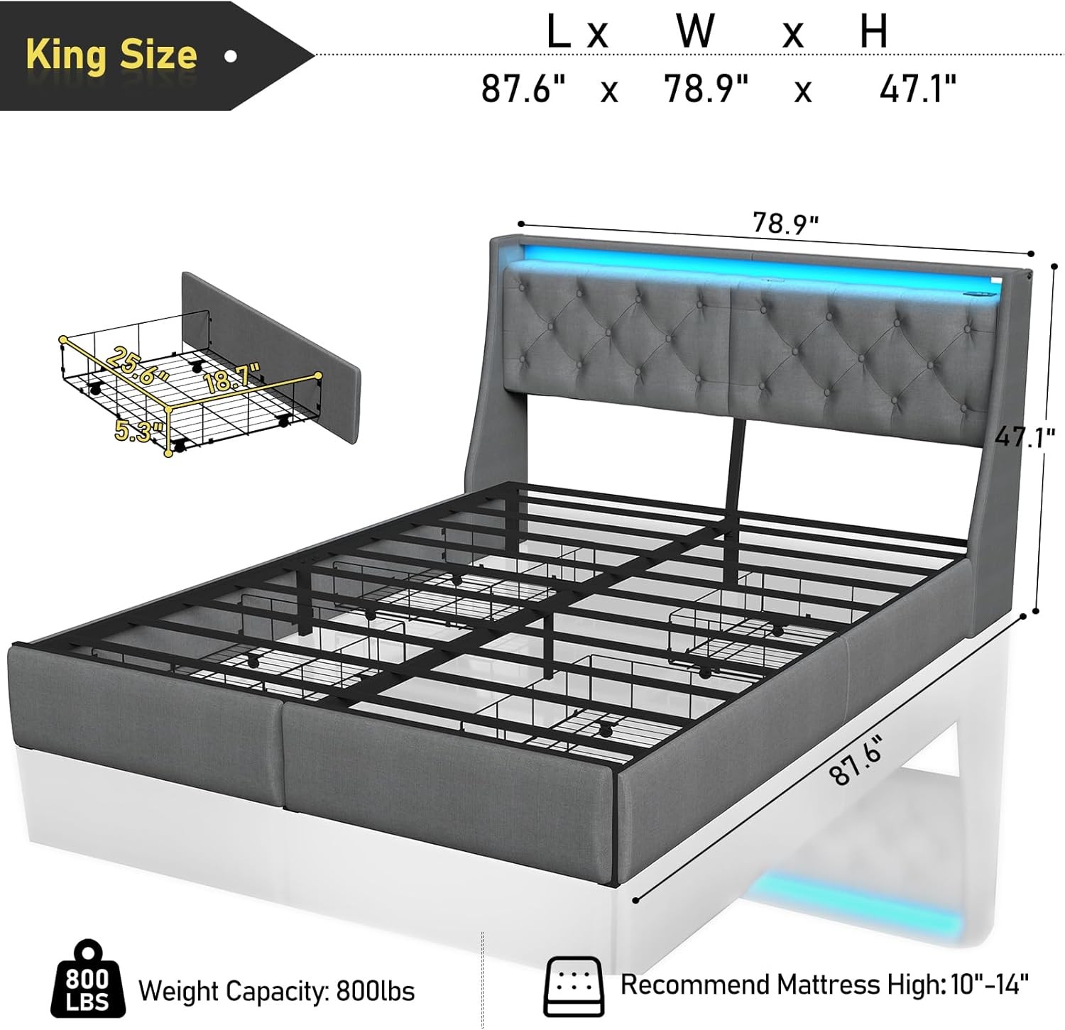 King Queen Full Size Bed Frame with Drawers Charging Headboard LED Lights