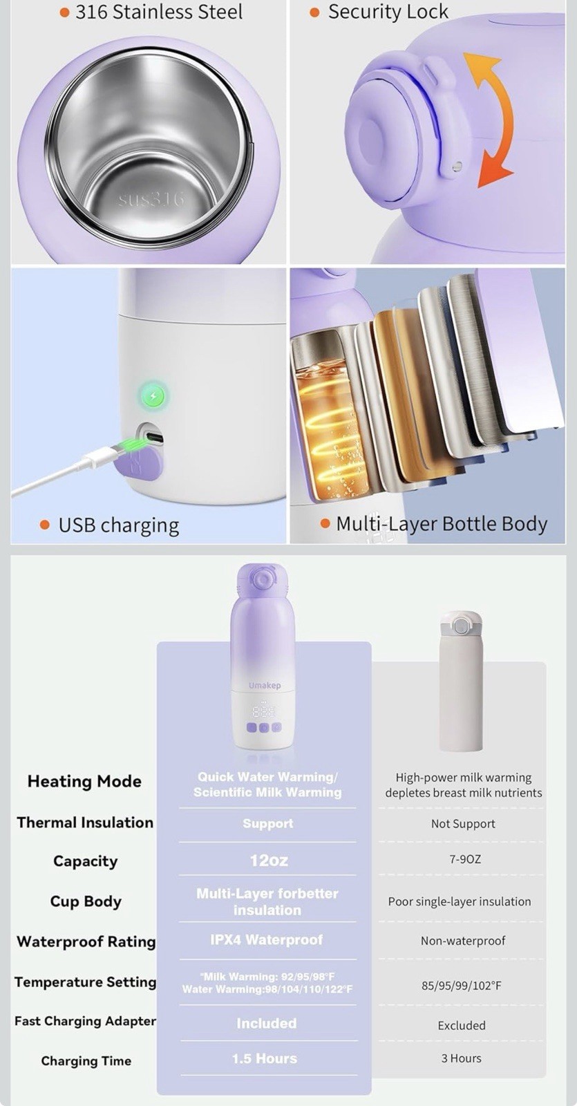 Portable Bottle Warmer for Travel, Dual Heating Modes, Color-Lilac