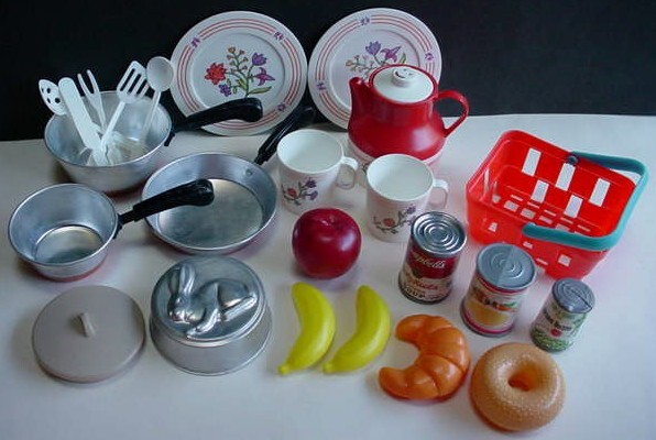 Vintage Kitchen Play Set Dishes Utensils Food Toys