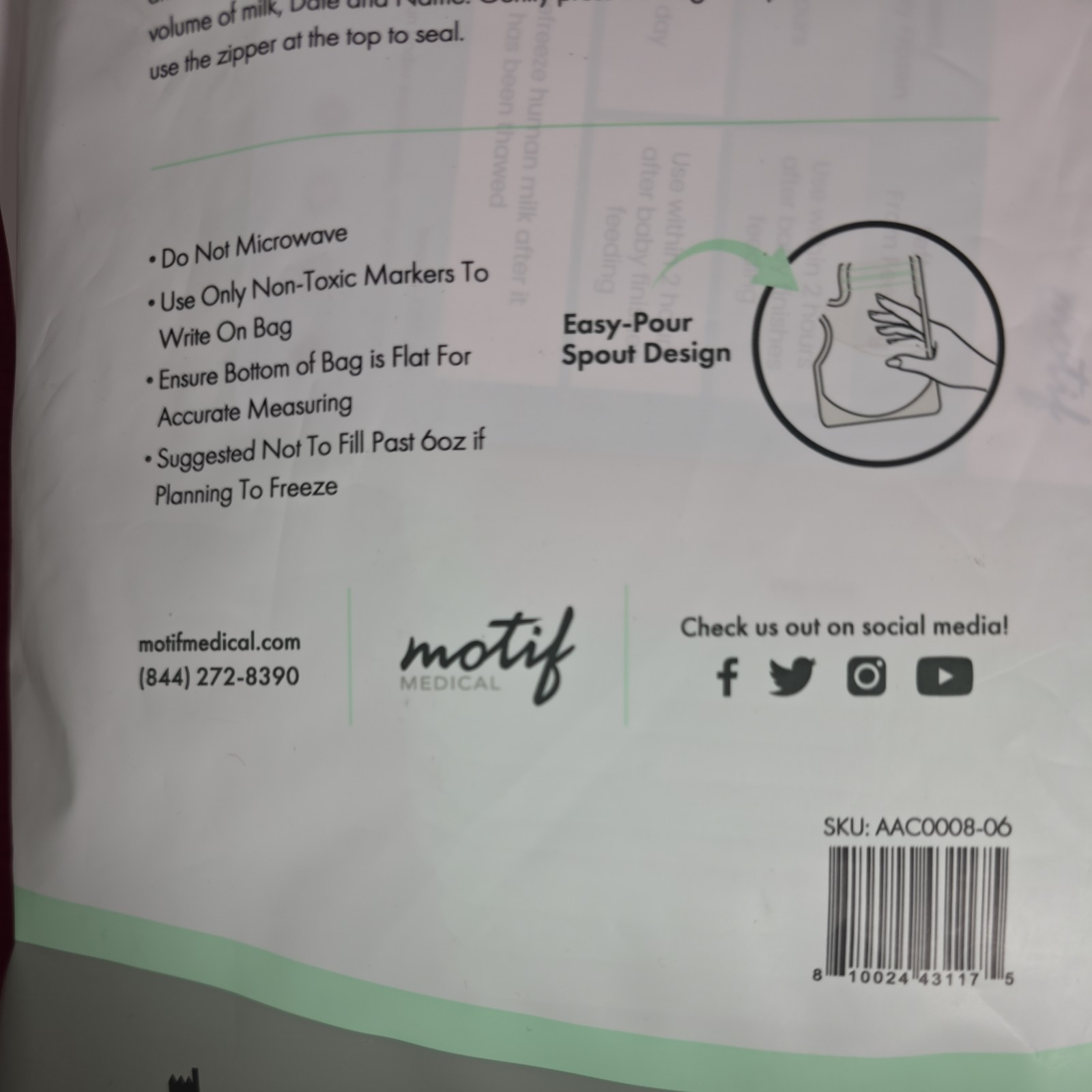 Motif Medical Breastmilk 8 oz Single Use Storage Bags BPA Free 100 count NEW