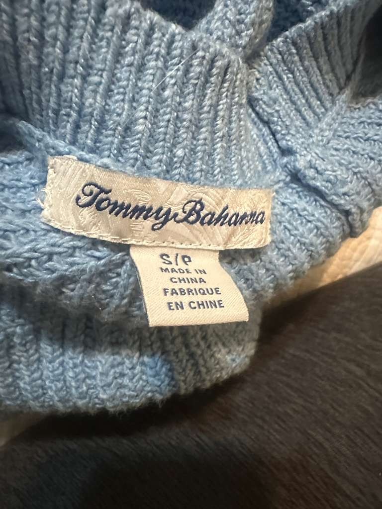 как выглядит Tommy Bahama Blue Sweater with White Leaf Design фото