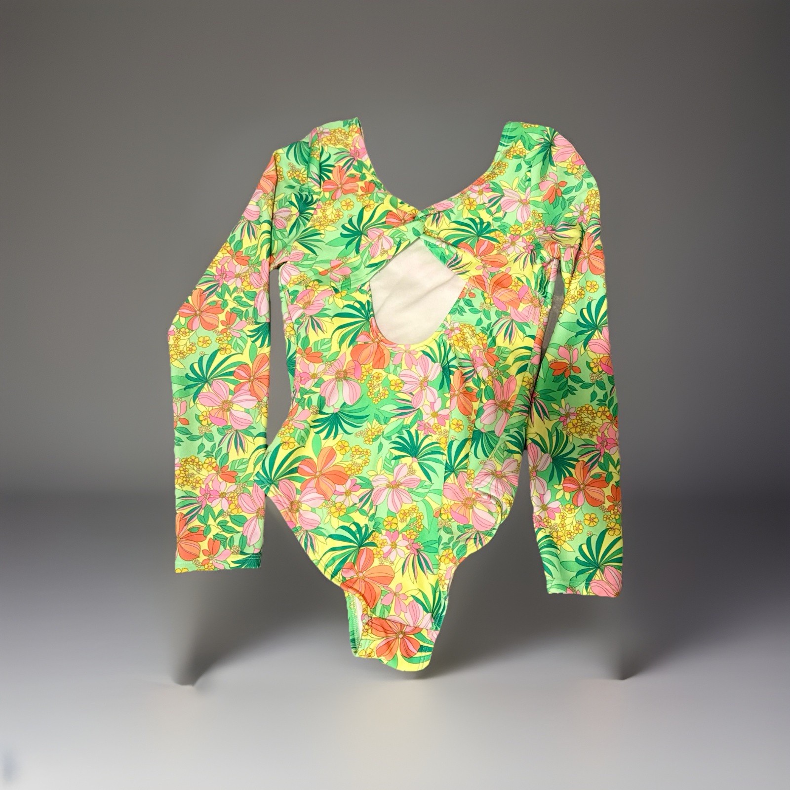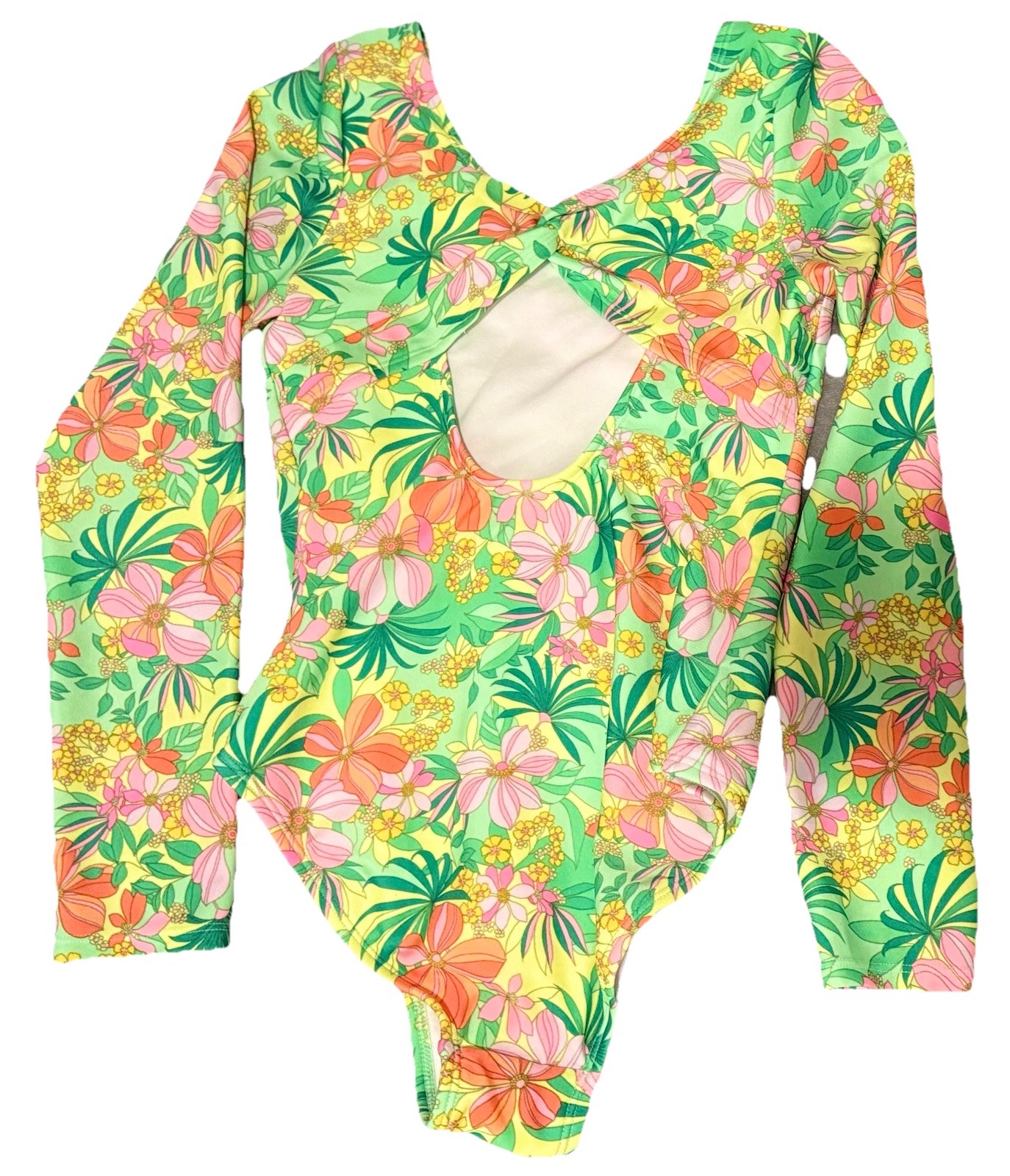 Art Class Swimsuit Girls Large 10/12 Green Floral Long Sleeve Cutout Back UPF50