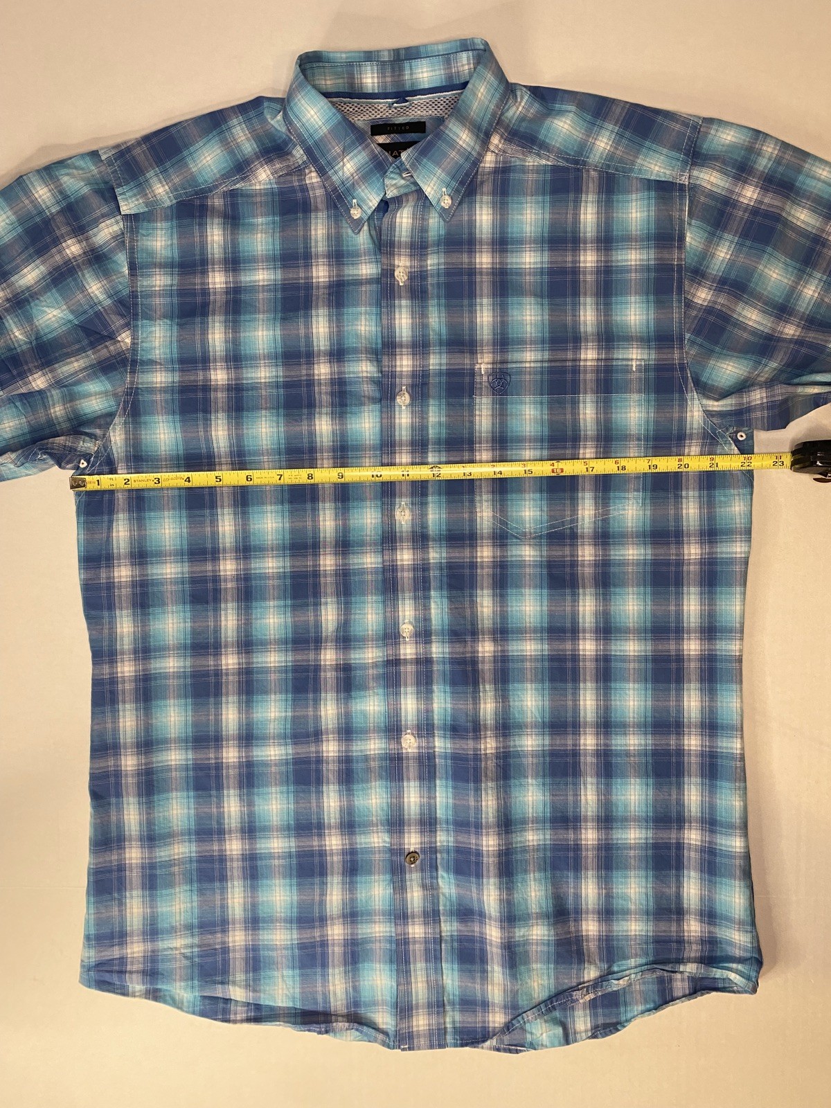 как выглядит Ariat Pro Series Mens L Fitted Blue Plaid Short Sleeve Western Button Down Shirt фото