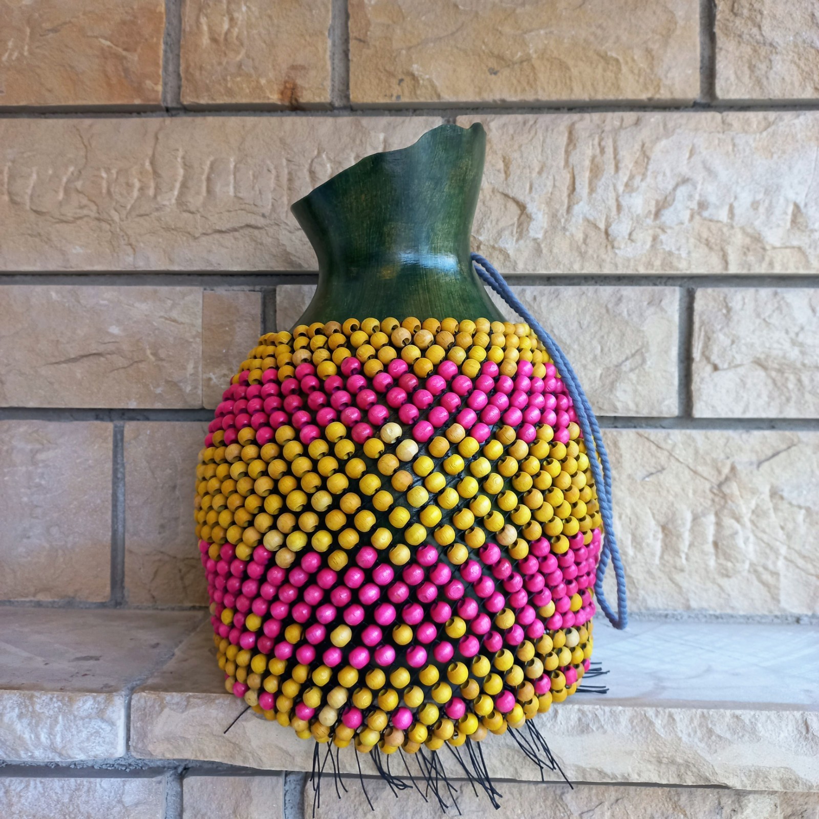 Bright Pink Yellow Wood Beaded Shekere - 14 Gourd Percussion Instrument