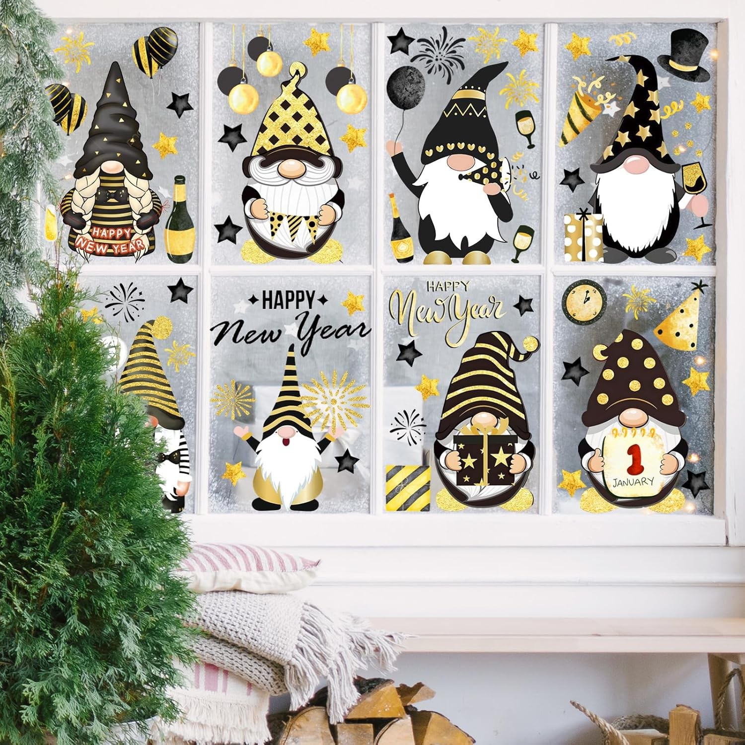 Whaline 9 Sheets Happy New Year Window Cling Stickers Black Gold Gnomes Reusable