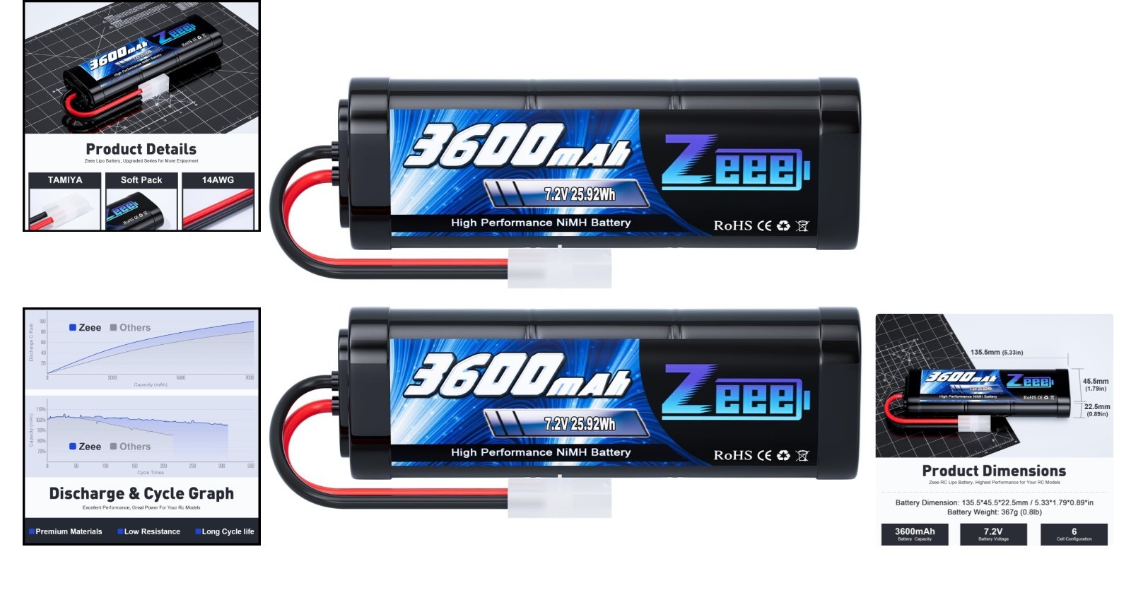 High Power 7.2V 3600mAh NiMH Battery - 2 Pack with Tamiya Plug for RC Vehicles