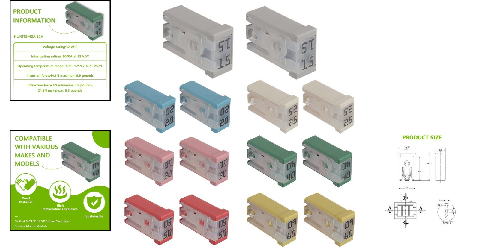 Durable 14pc Mini Slotted Automotive Fuse Set - 15A to 60A, 32V Voltage Rating