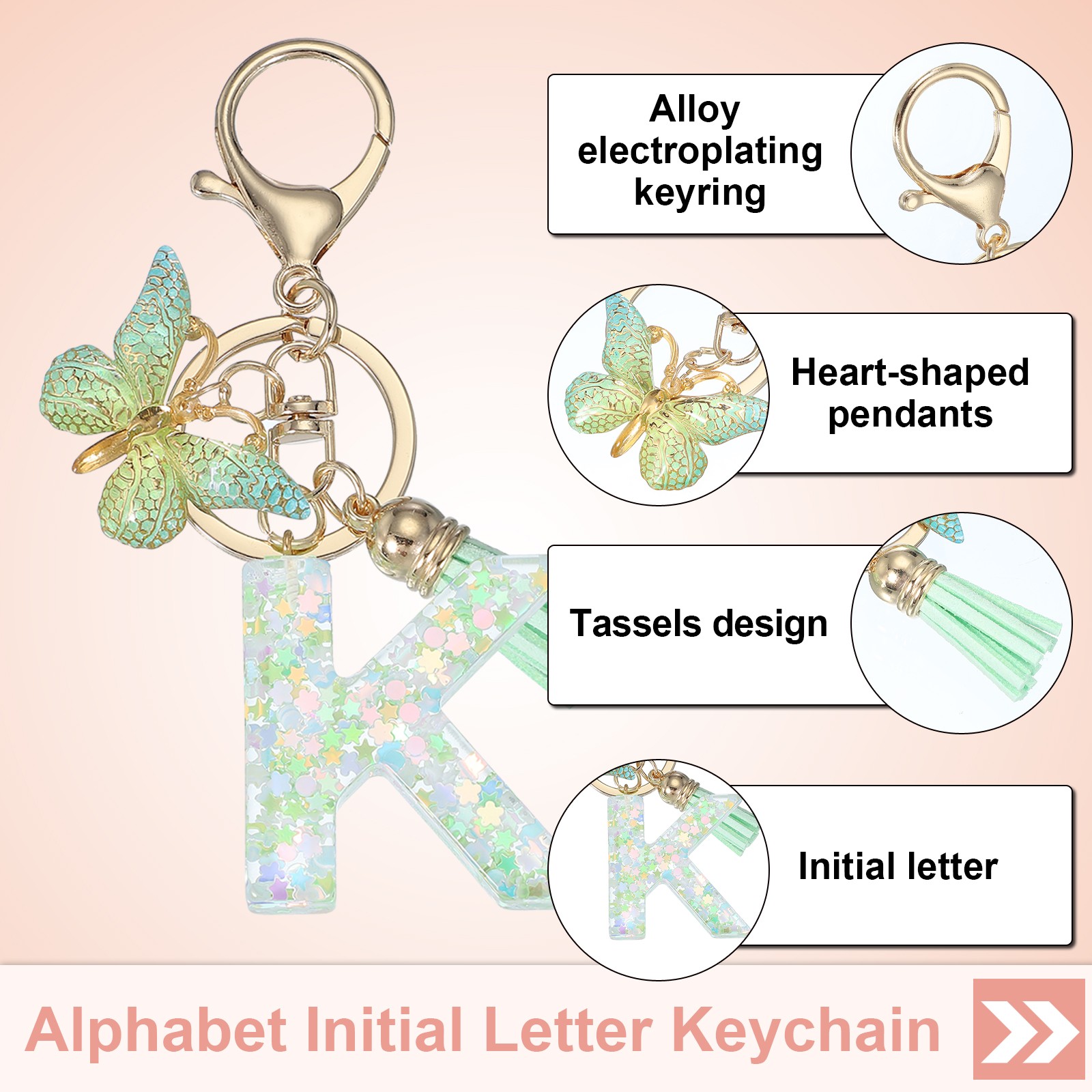 Alphabet Initial Letter Keychain Cute Charm with Tassel Butterfly Letter K Green