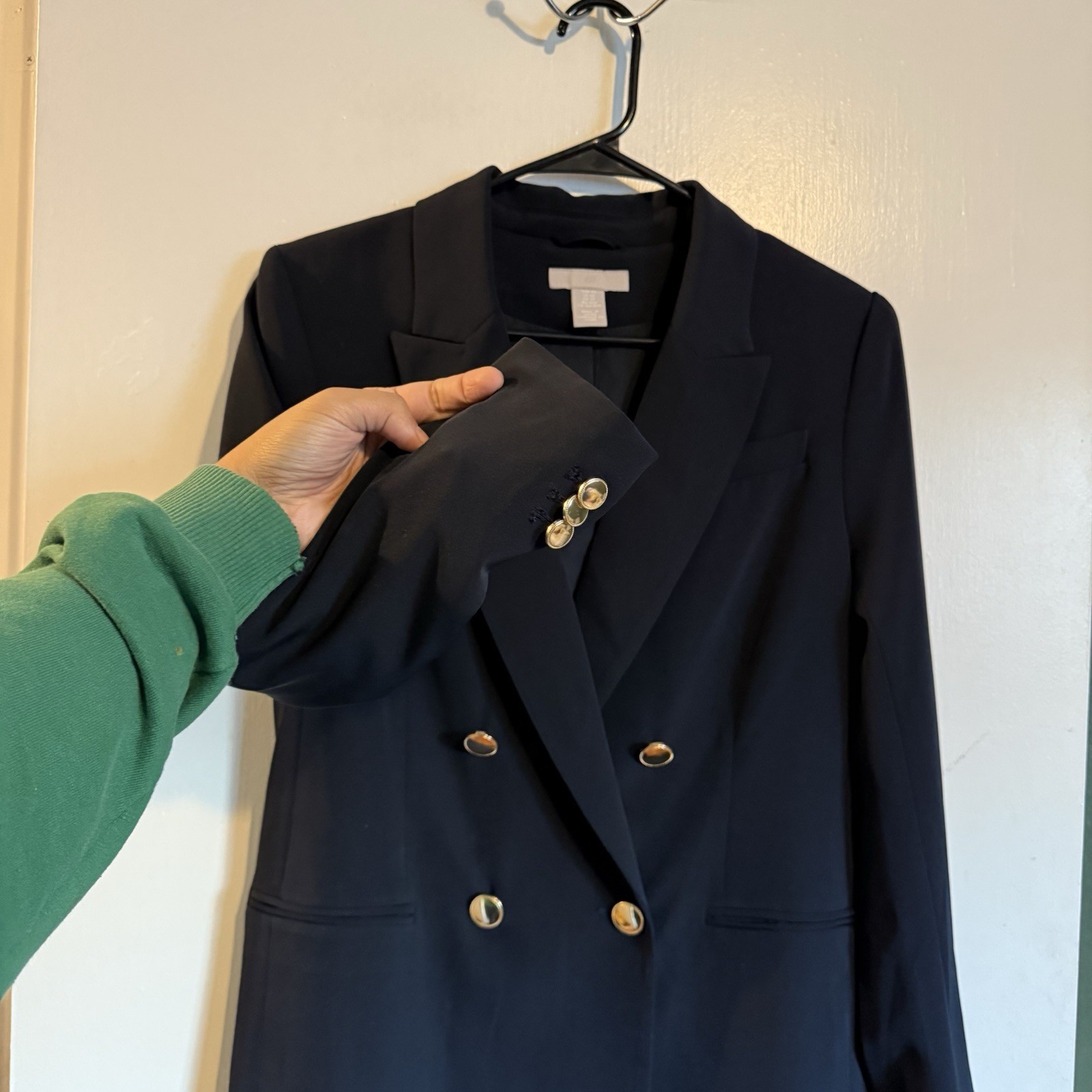 как выглядит H M dark navy blue double breasted long blazer size XS фото