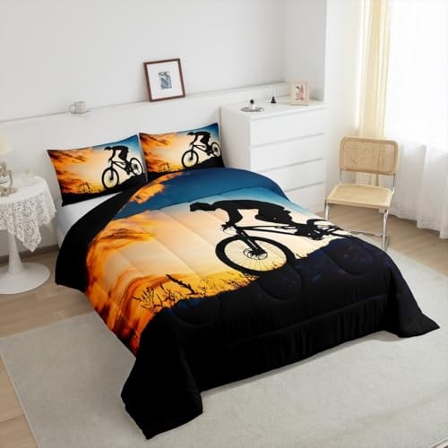 Boys Bicycle Rider Size Comforter Set,Mountain Bike Pattern Twin Black Yellow