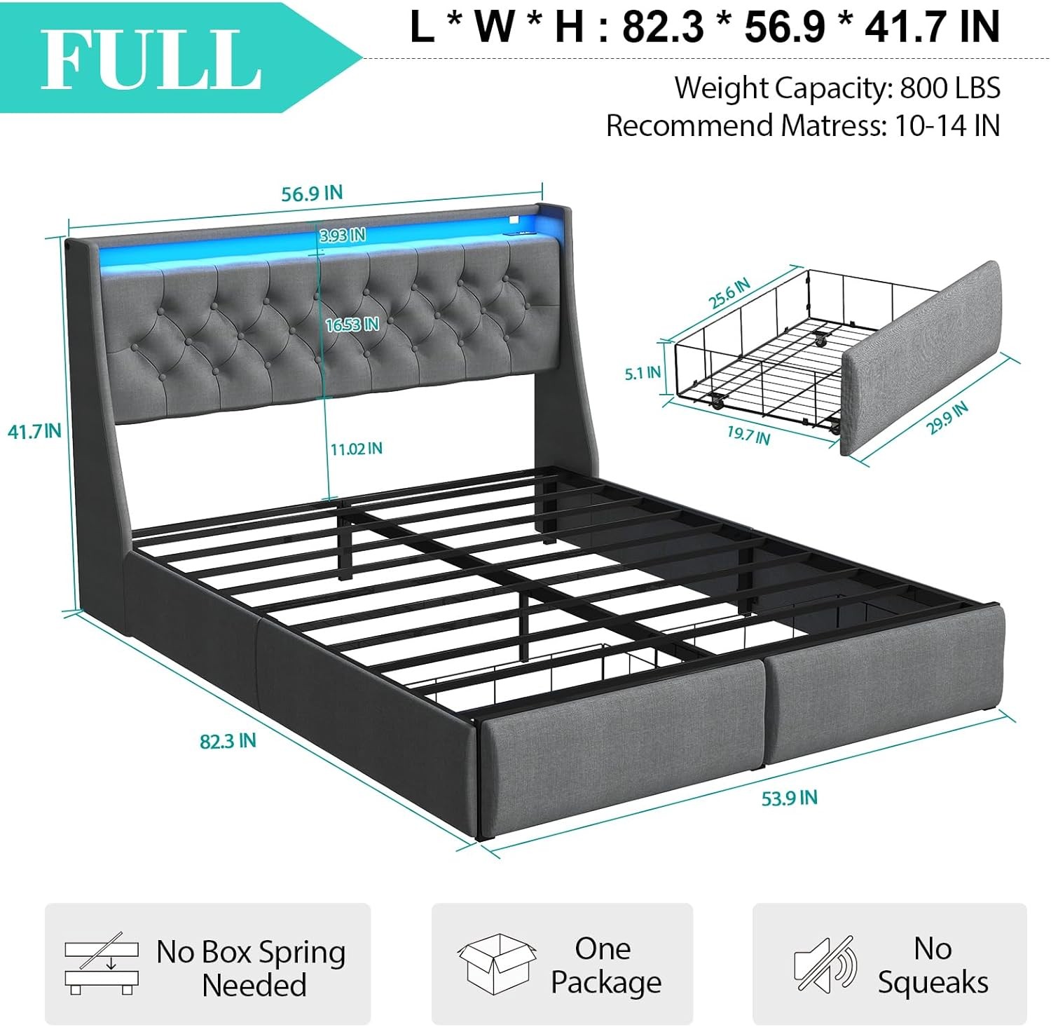 Full/Queen LED Bed Frame with Headboard and 2 Storage Drawers,Charging Station