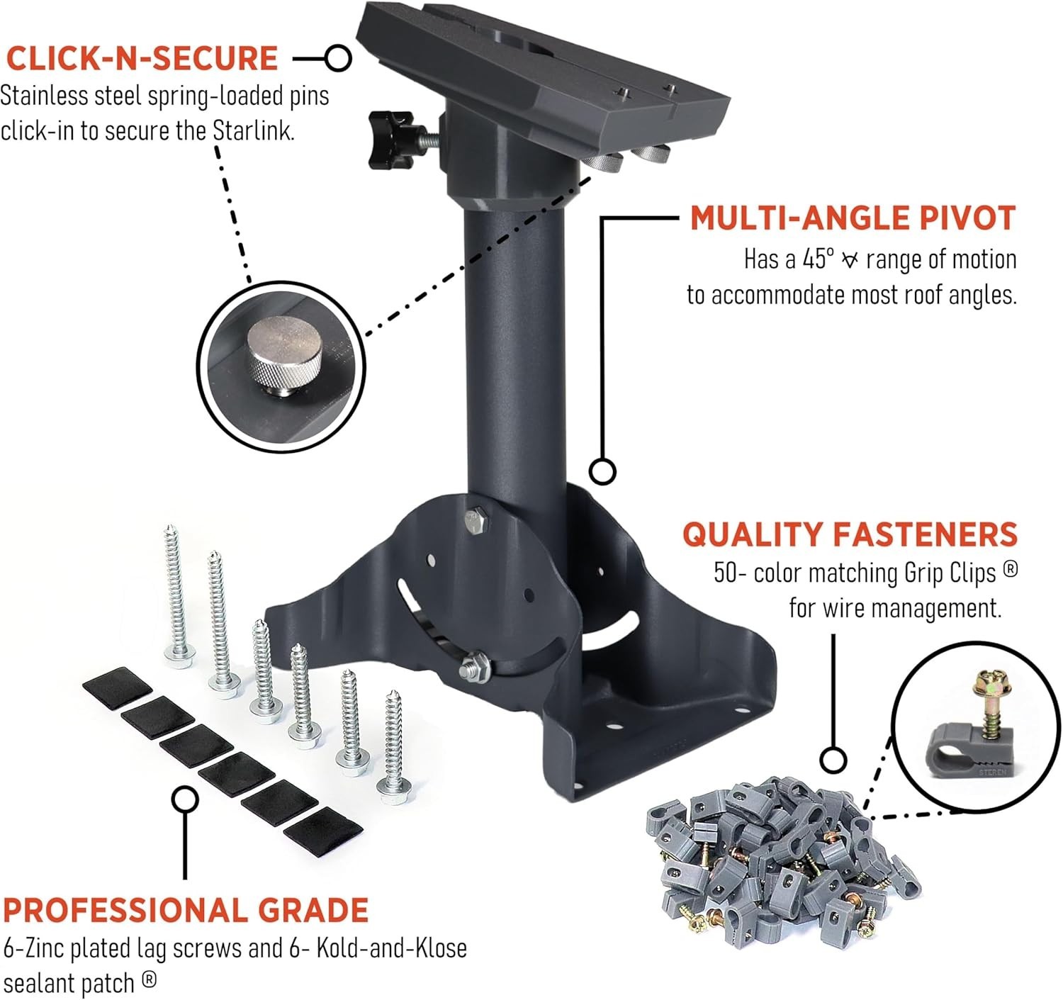 Included Components: Lag Screws, Pitch Pads, Pivot Mount, Wire Clips