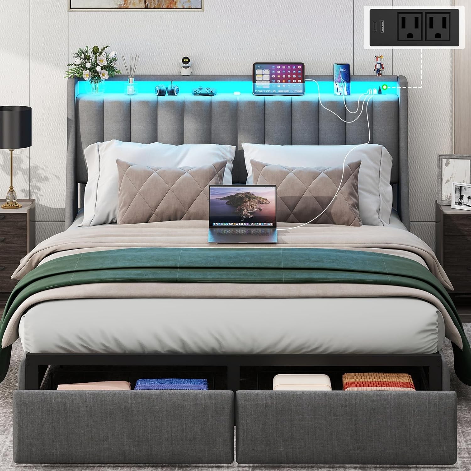 Full/Queen/King LED Bed Frame with Headboard,Storage Drawers,Charging Station