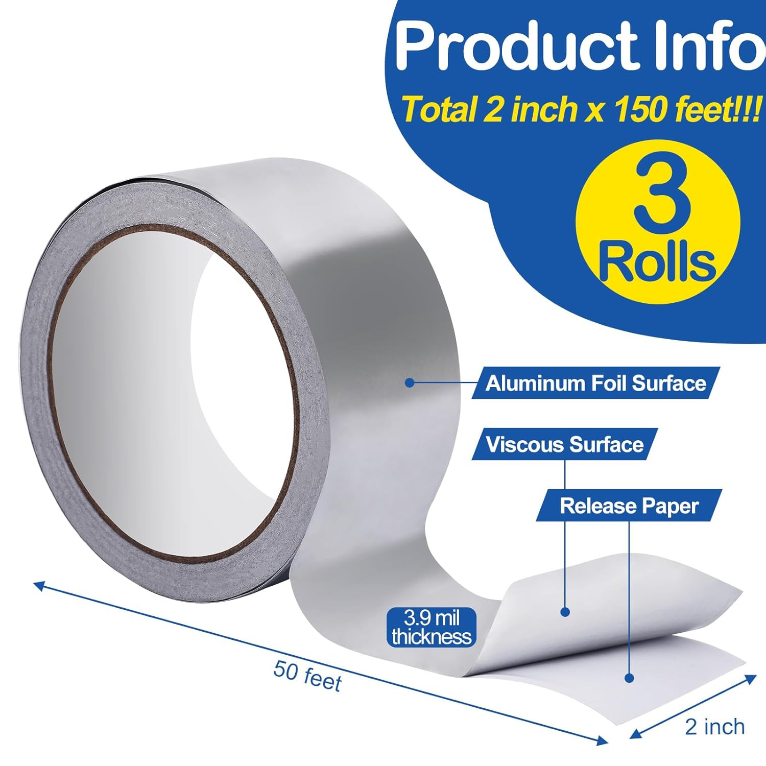 3 Pack Aluminum Foil Tape, 3.9 Mil 2 X 150 Feet Total, Silver High Temperature