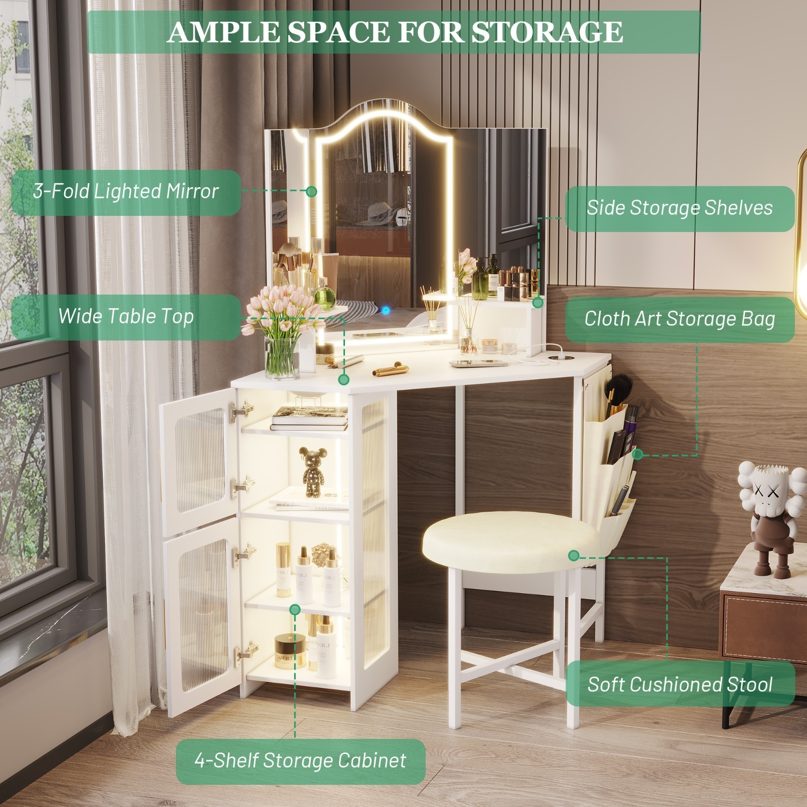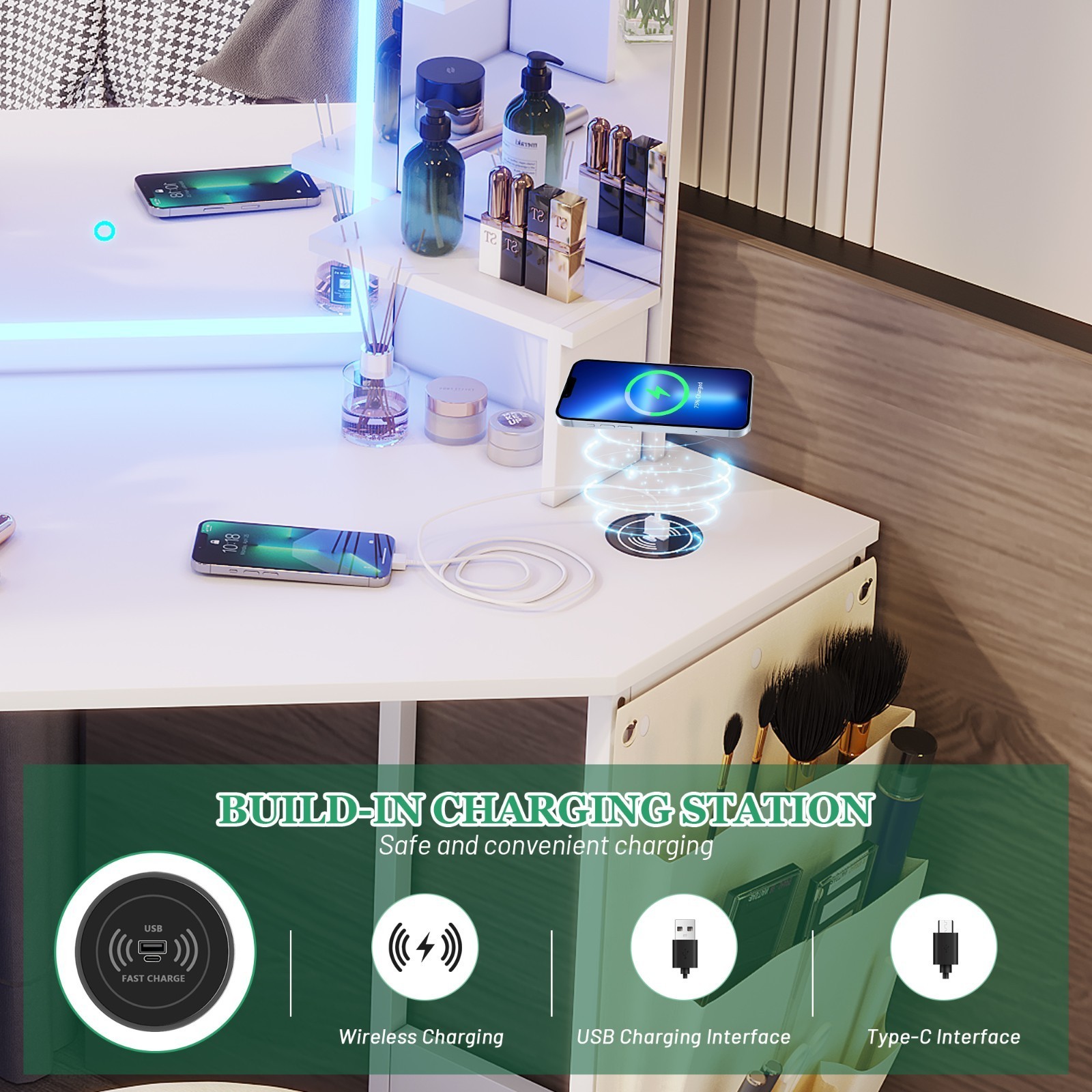 Corner Vanity Desk with Mirror and Lights, Makeup Vanity with Charging Station
