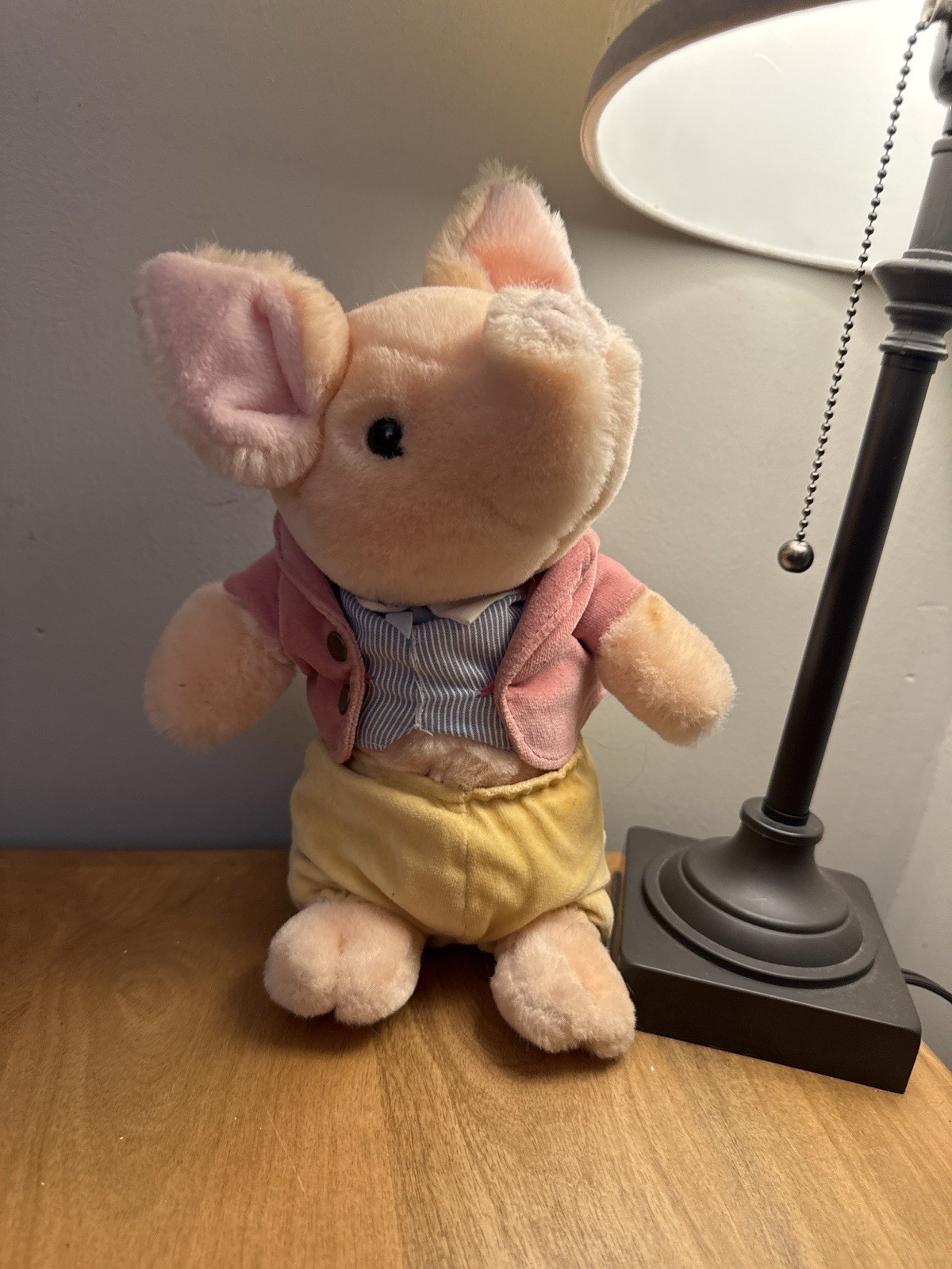 Eden Toys Anthropomorphic Pig Plush Pink Jacket Yellow Pants 11 Sitting