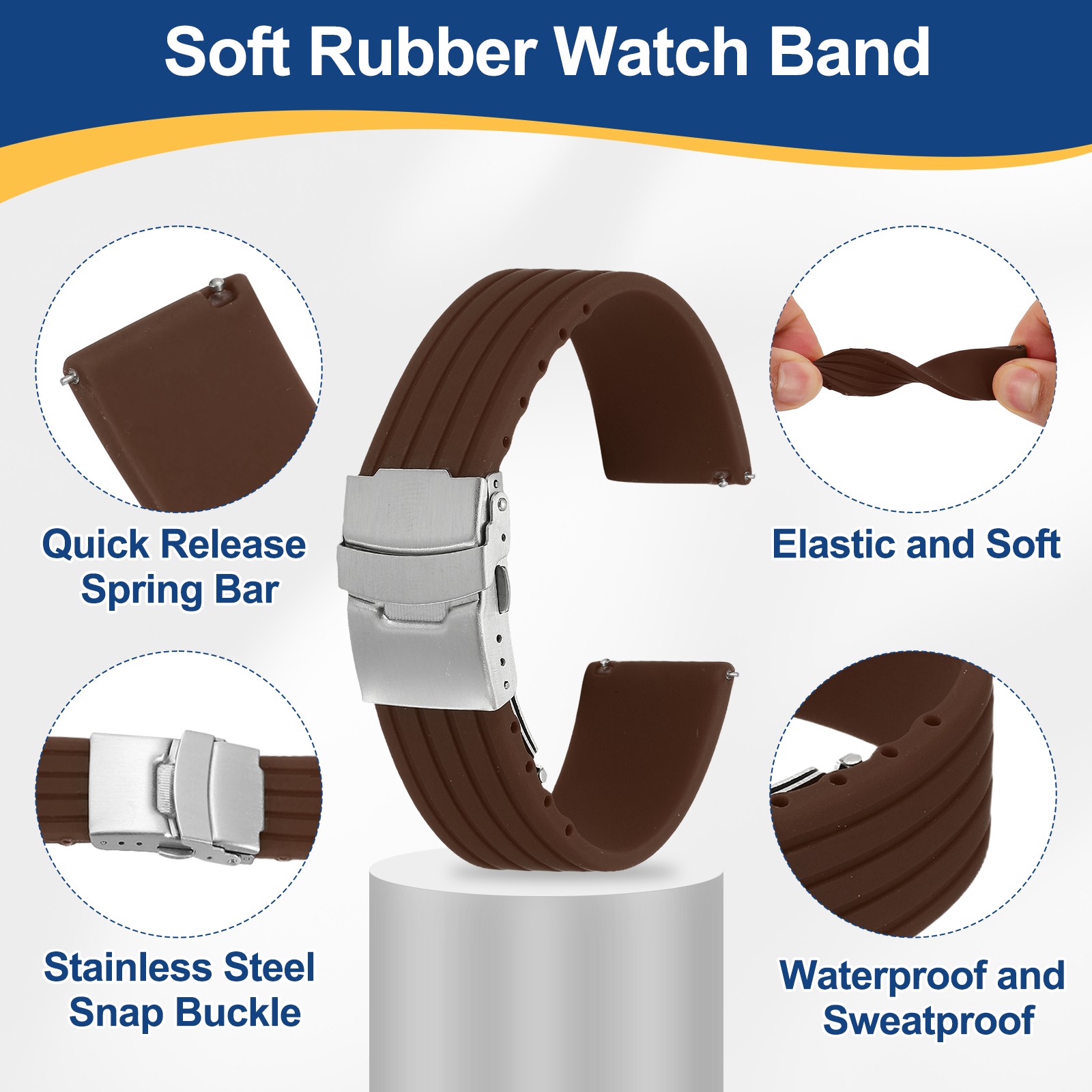 Silicone Watch Bands 22mm Soft Watch Bands with Silver Snap Buckle, Brown