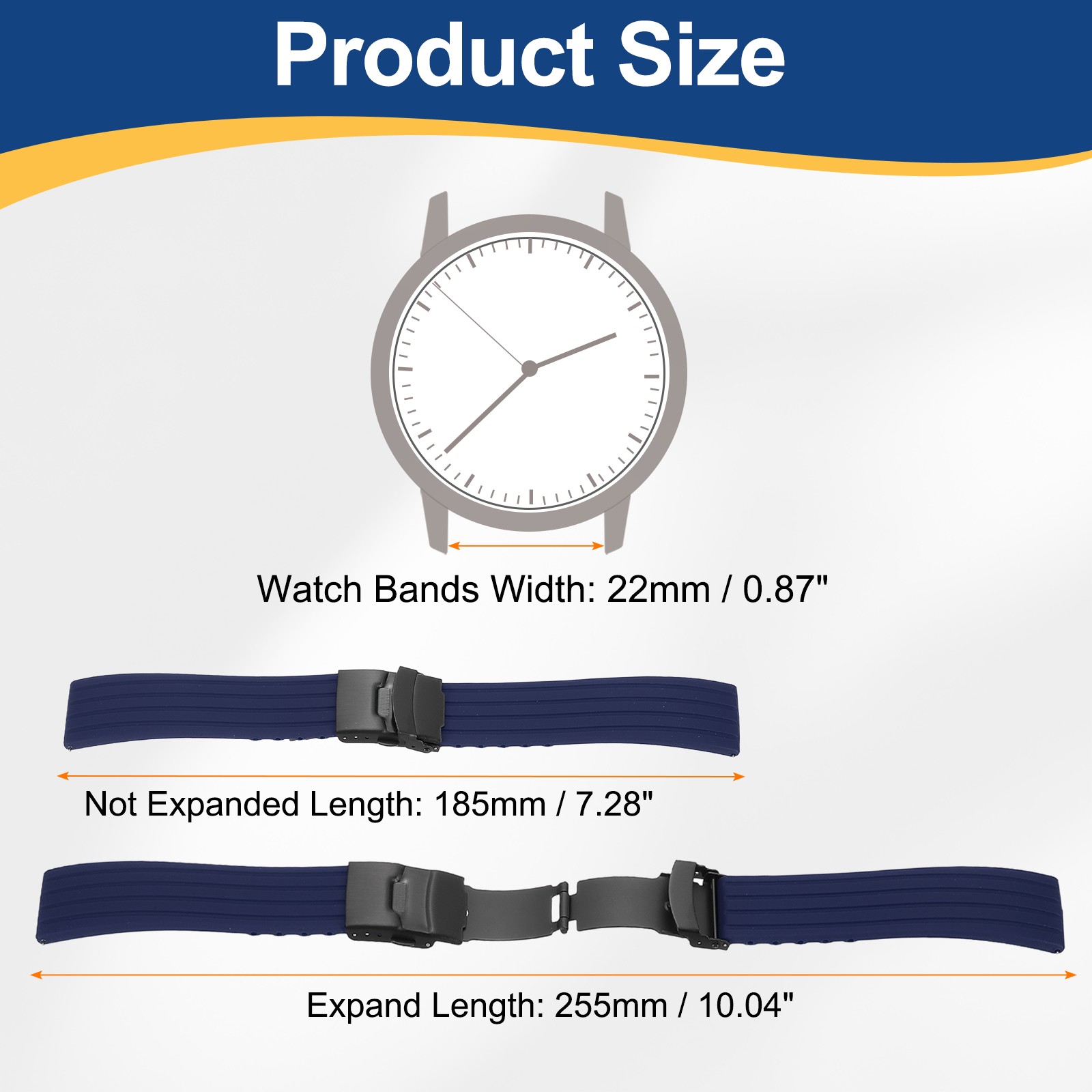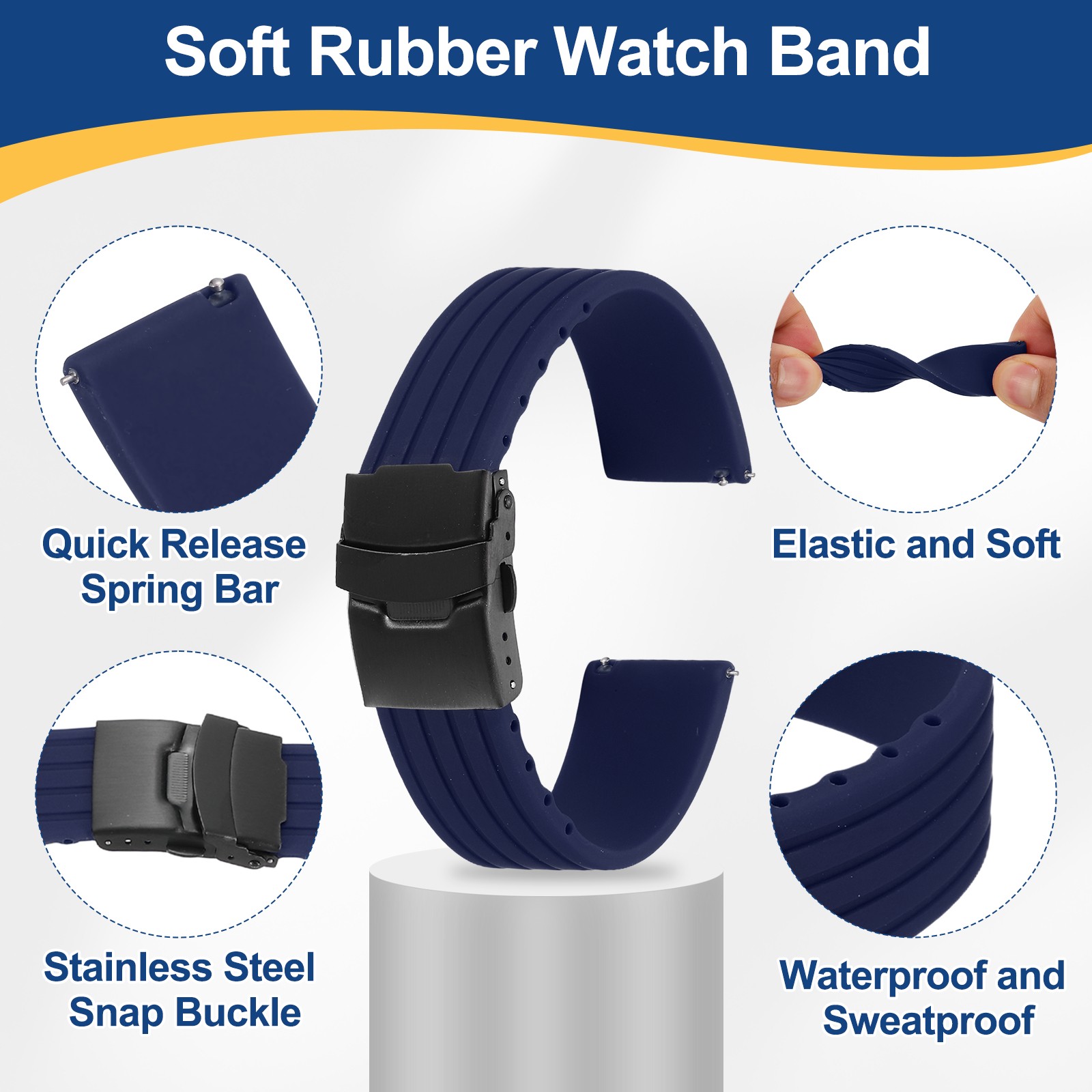 Silicone Watch Bands 22mm Soft Watch Bands with Black Snap Buckle, Dark Blue