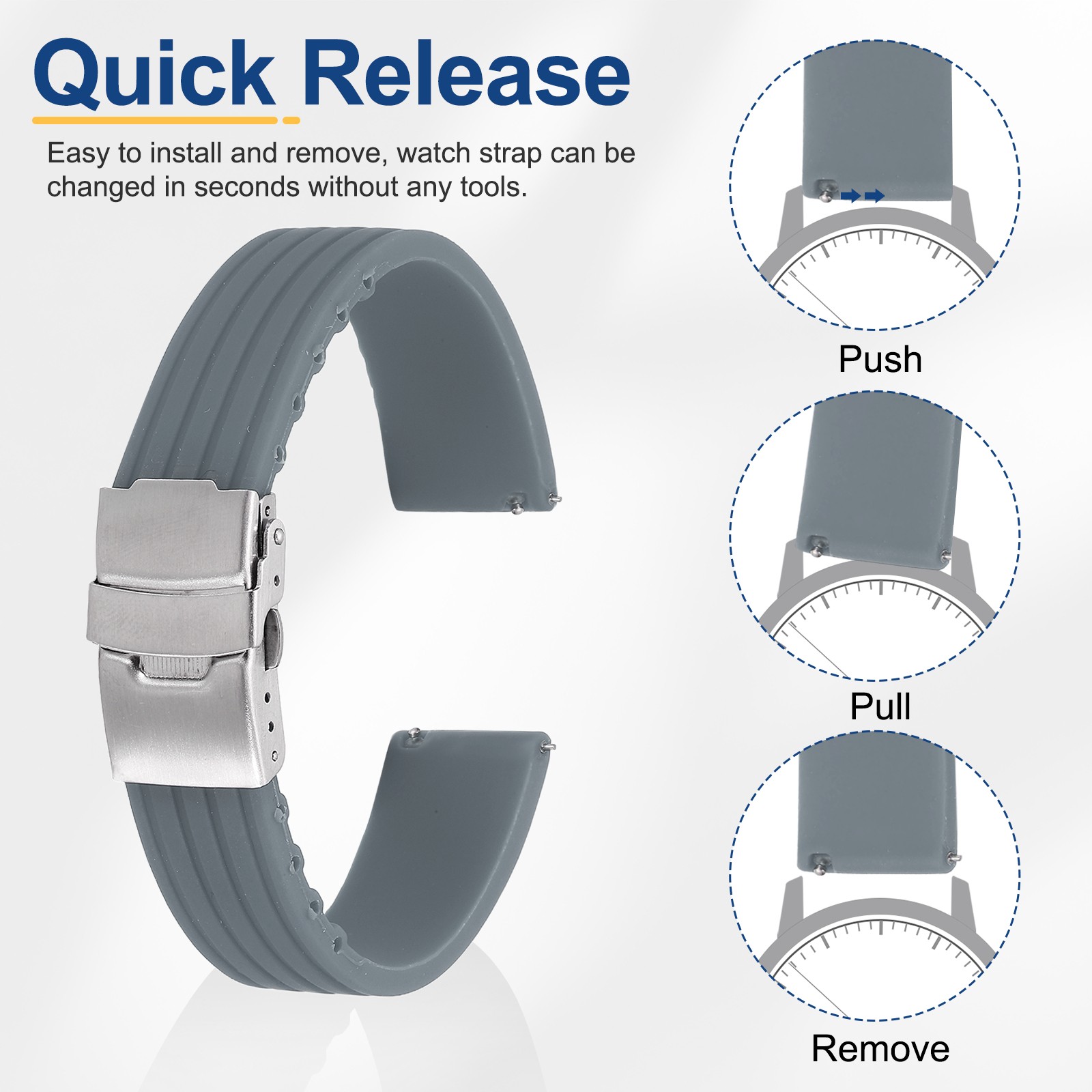 Silicone Watch Bands 18mm Soft Watch Bands with Silver Snap Buckle, Gray