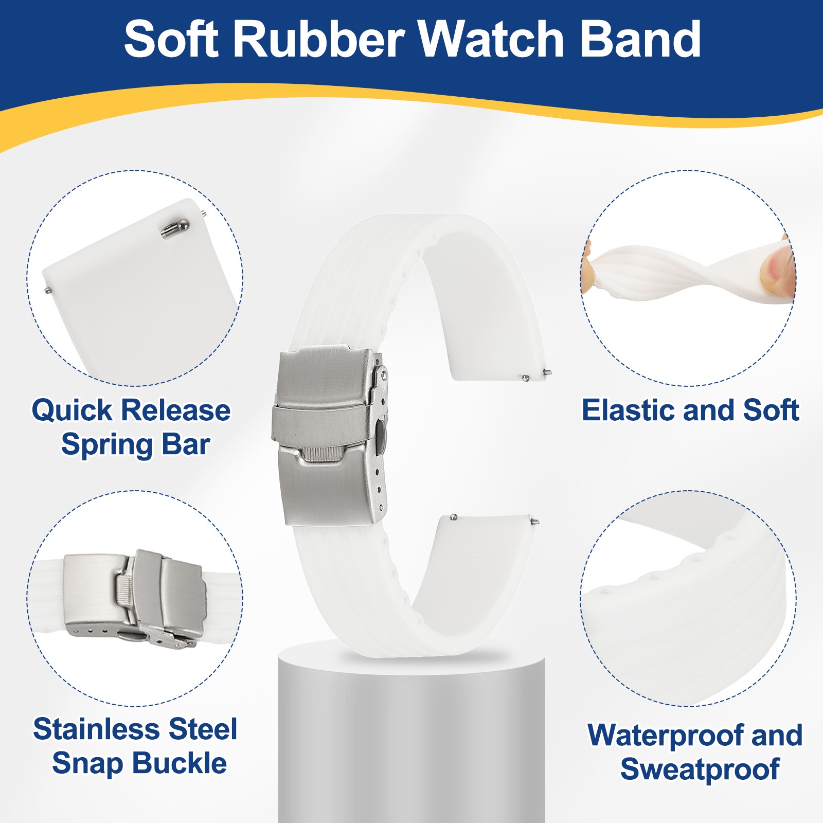 Silicone Watch Bands 18mm Soft Watch Bands with Silver Snap Buckle, White