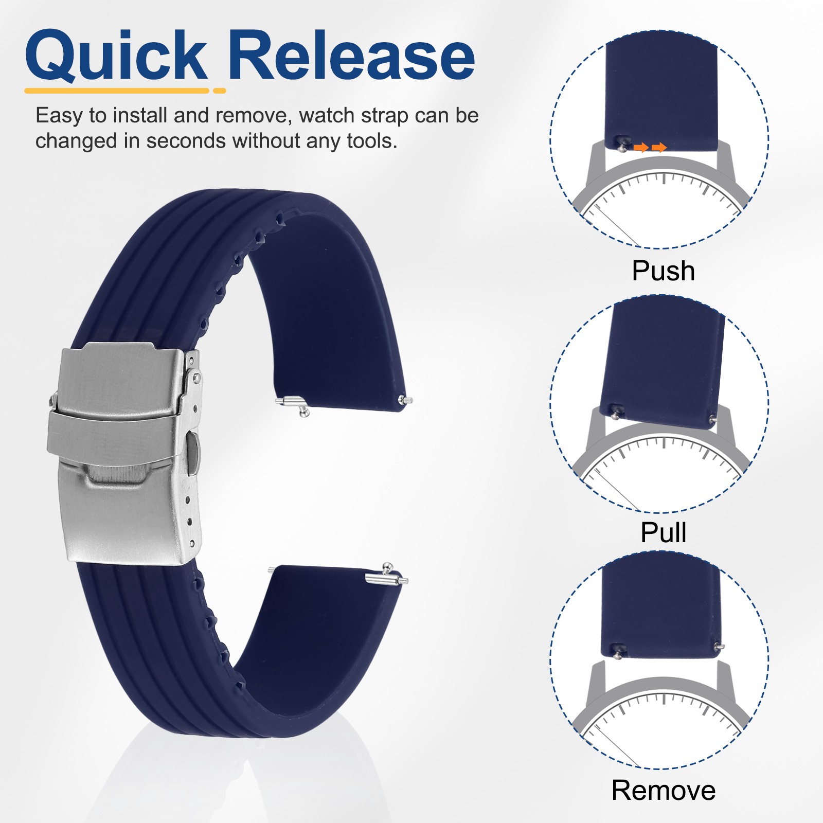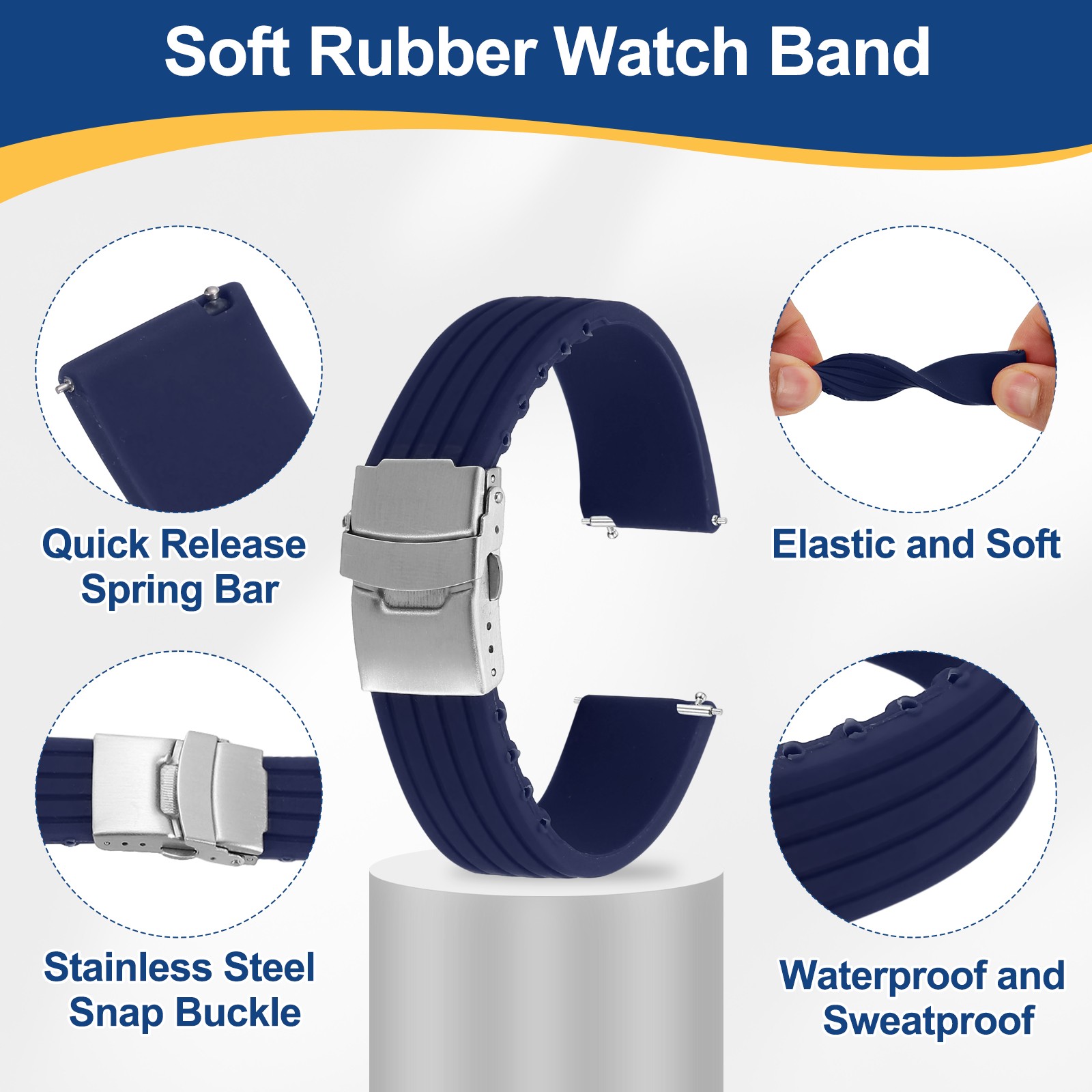 Silicone Watch Bands 20mm Soft Watch Bands with Silver Snap Buckle, Dark Blue