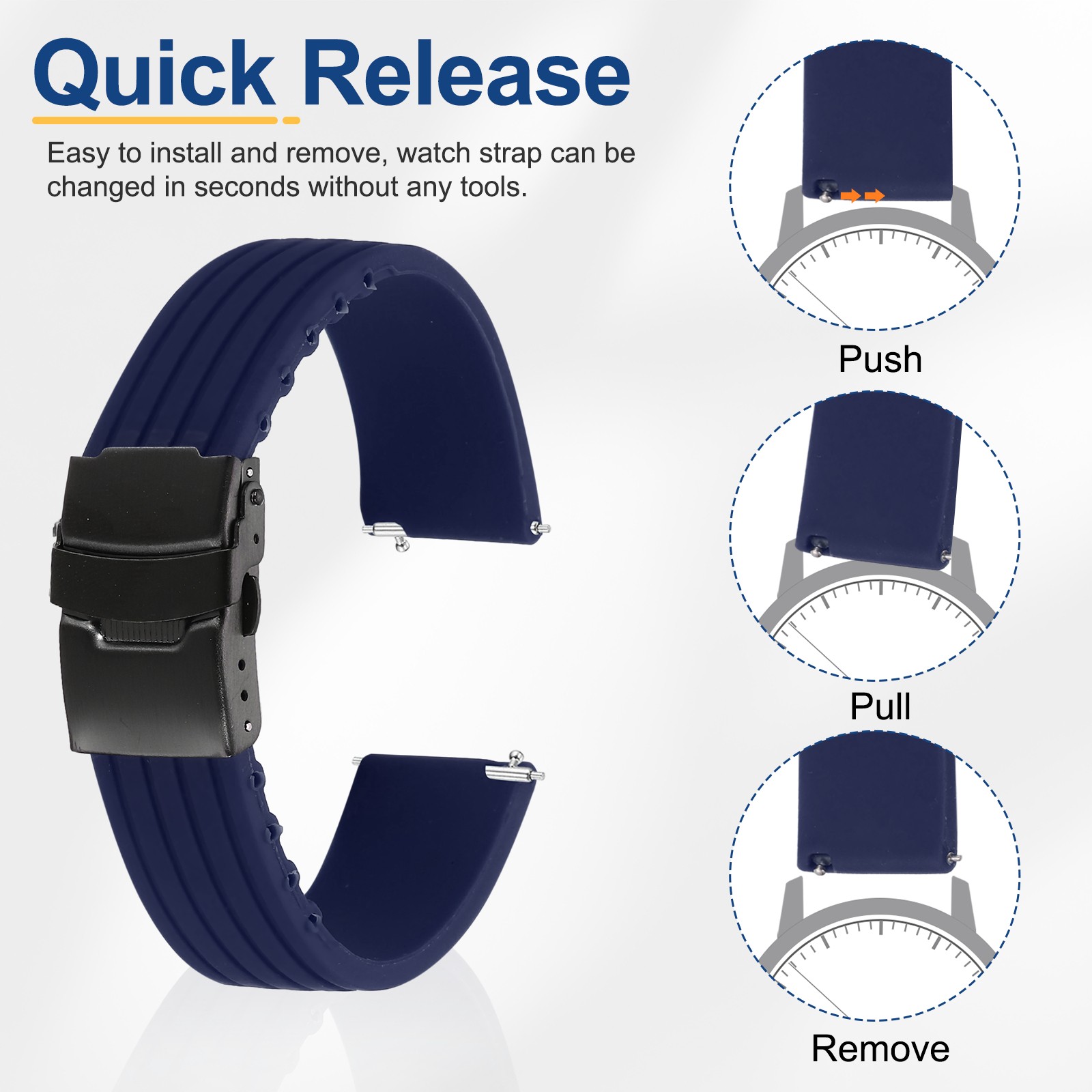 Silicone Watch Bands 20mm Soft Watch Bands with Black Snap Buckle, Dark Blue