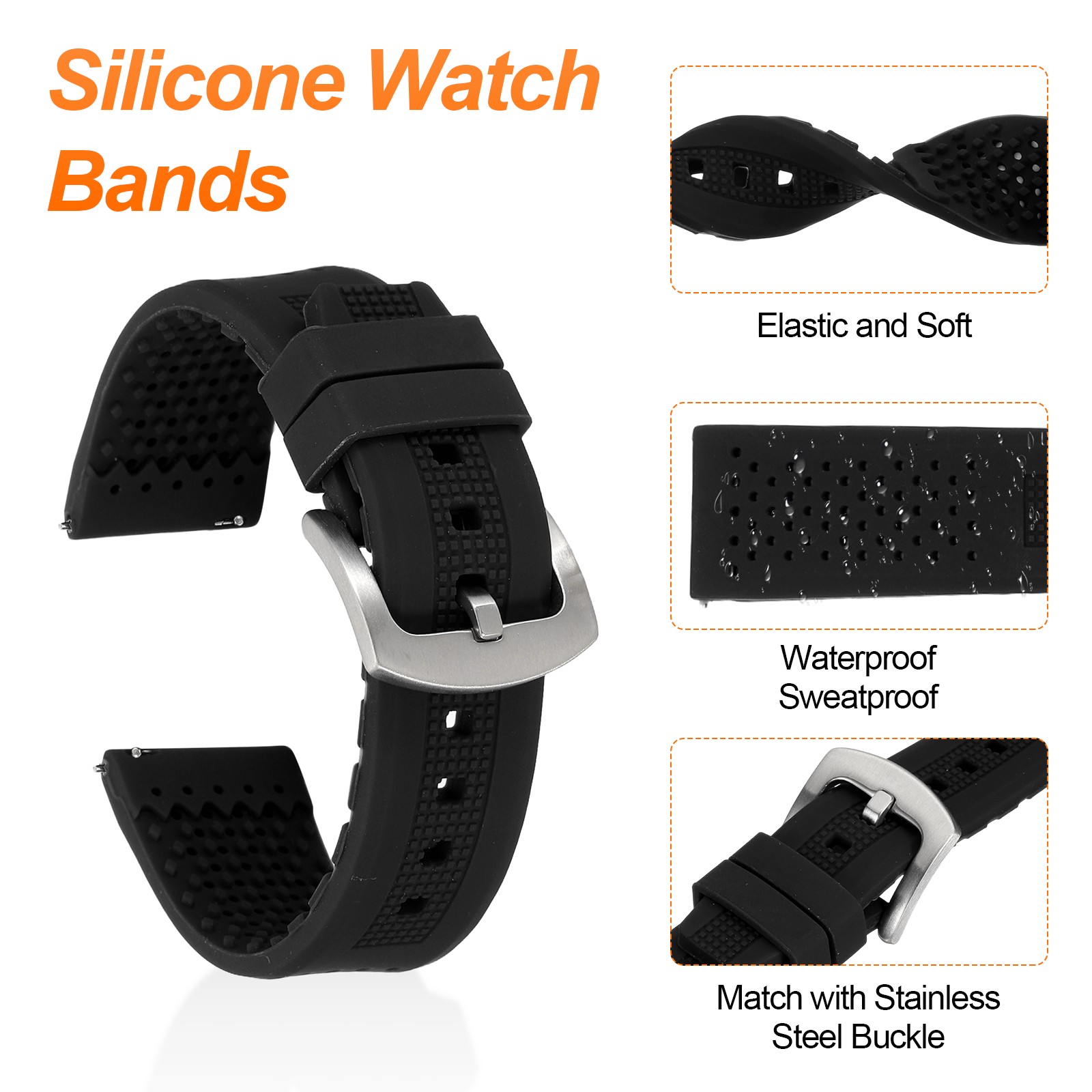 Silicone Watch Bands 22mm Soft Watch Bands with Silver Buckle, Black