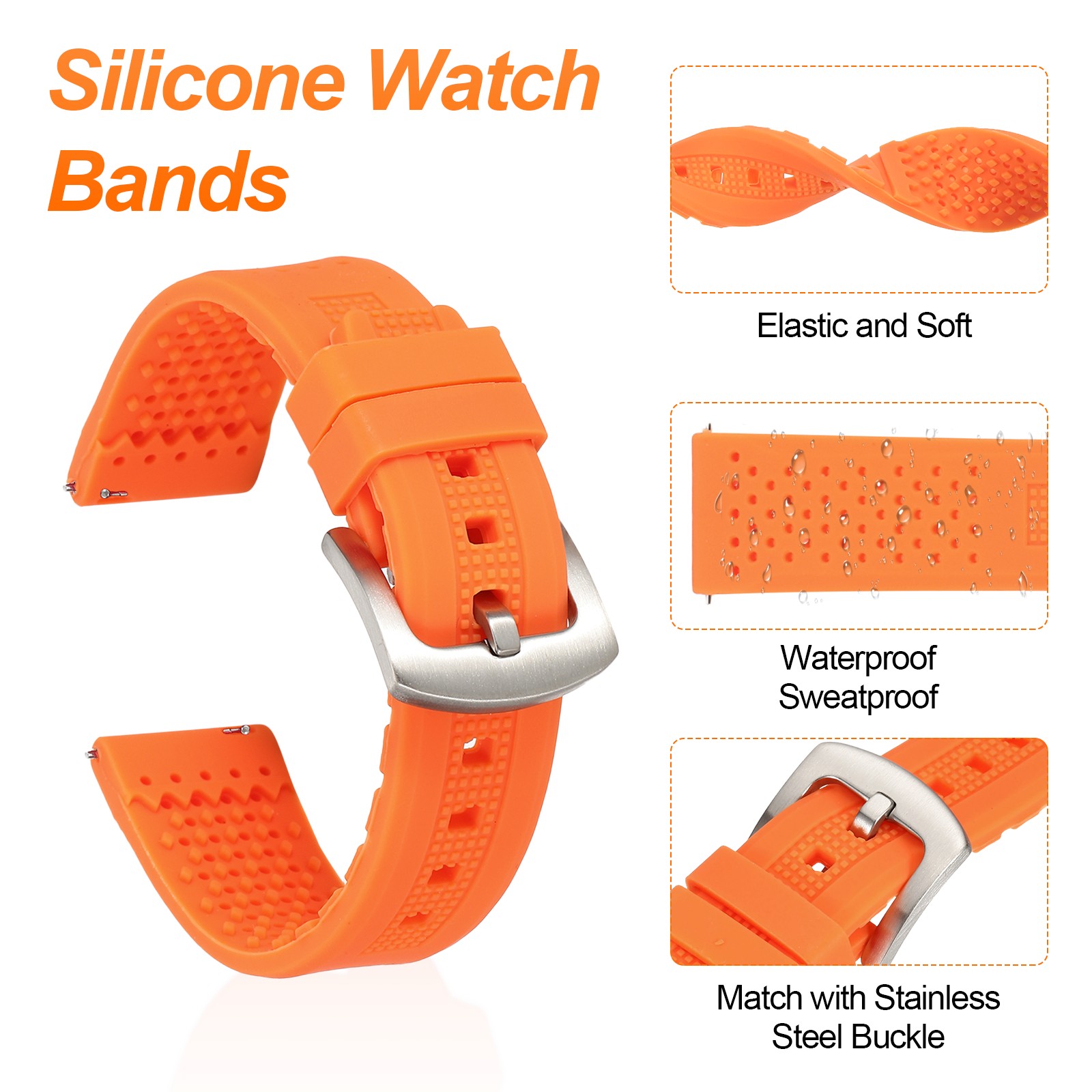 Silicone Watch Bands 20mm Soft Watch Bands with Silver Buckle, Orange