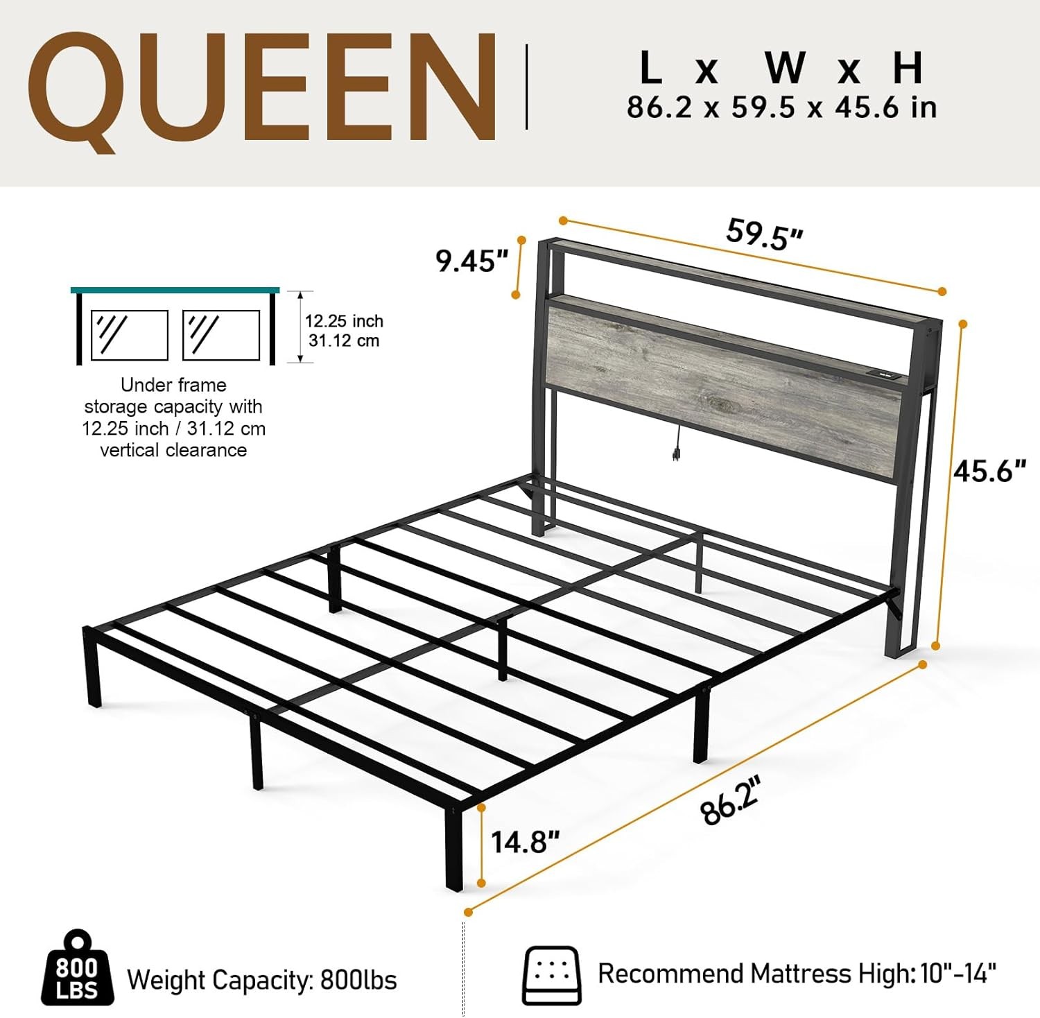 Full Queen King Metal Bed Frame with LED Storage Headboard and Charging Station