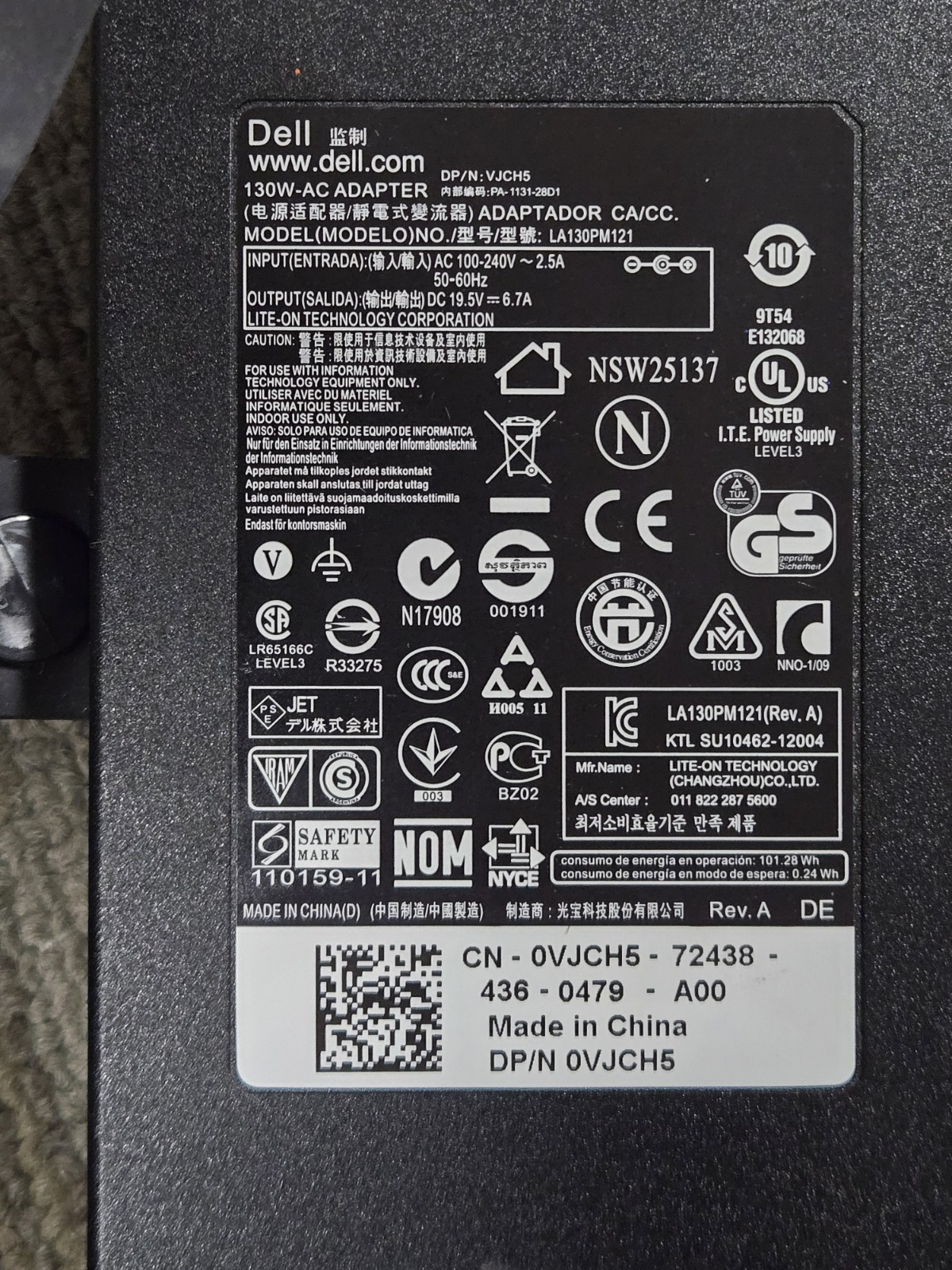 Genuine Dell 130w Laptop AC Adapter Charger 19.5V Model LA130PM121