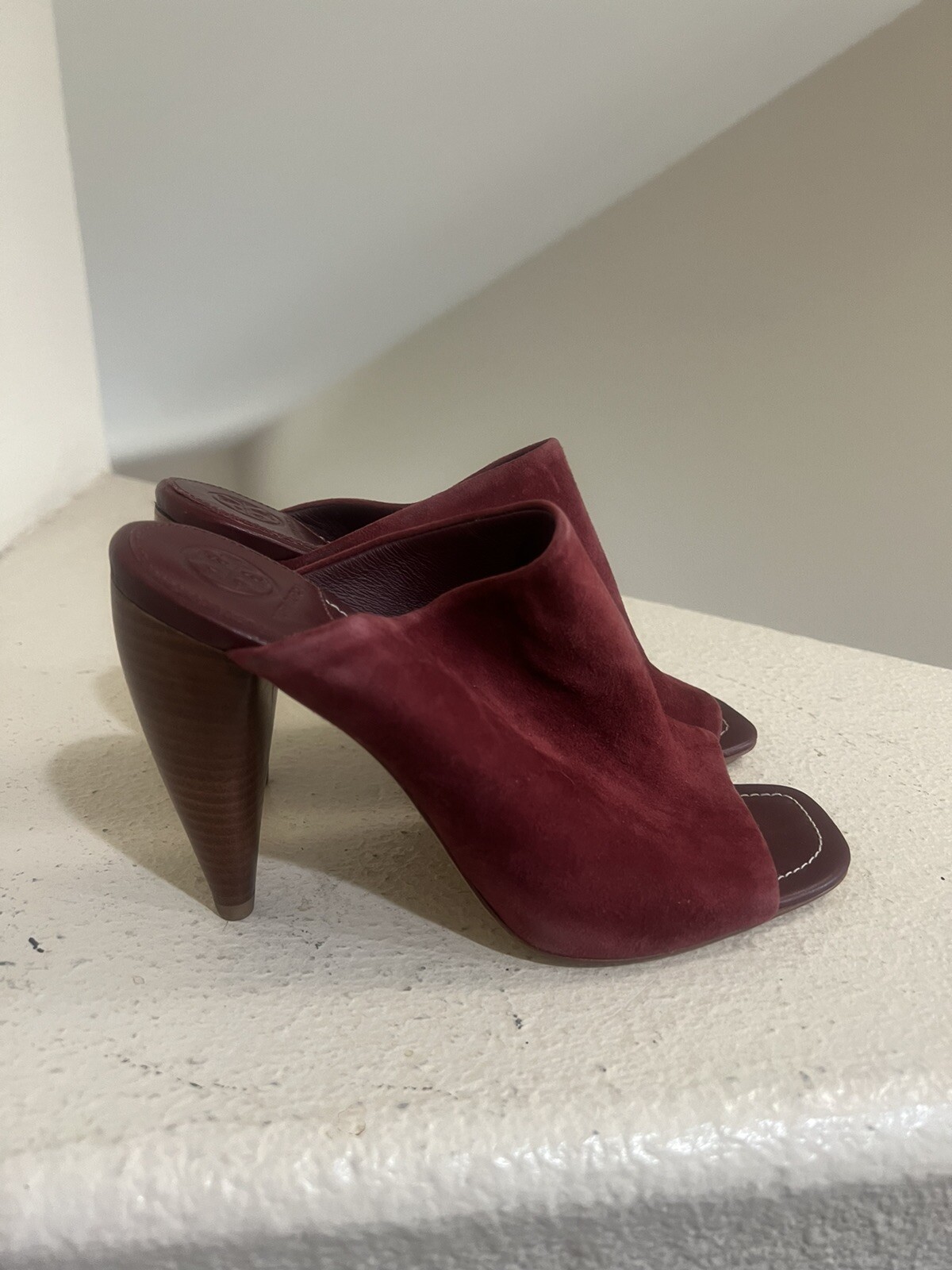 Tory Burch Maroon Red Ellis Suede Thick Heeled Mules Sandals Open Toes Size 7