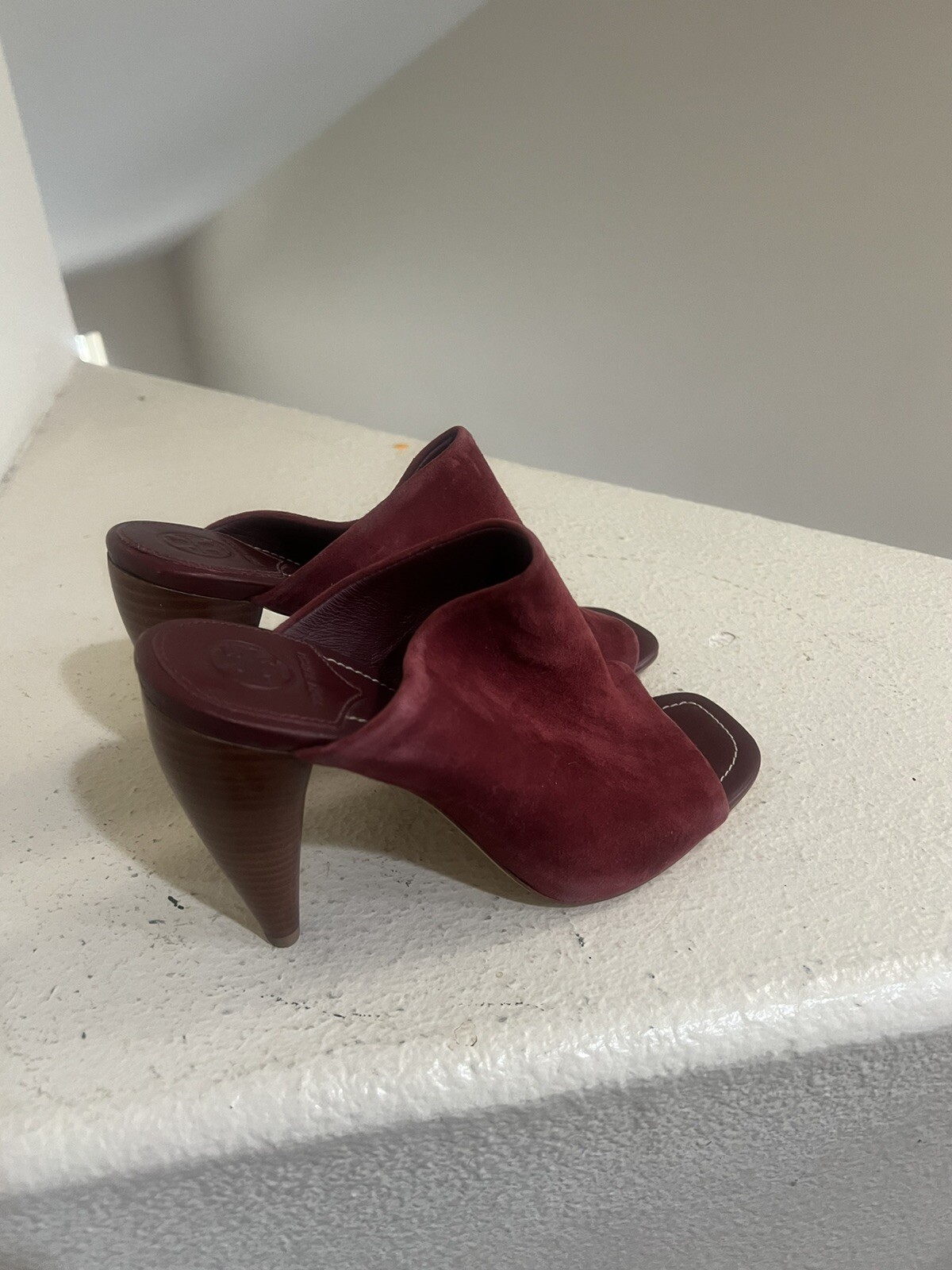 как выглядит Tory Burch Maroon Red Ellis Suede Thick Heeled Mules Sandals Open Toes Size 7 фото