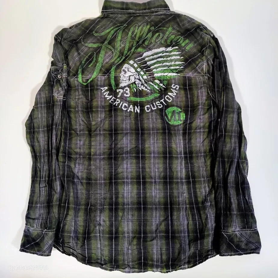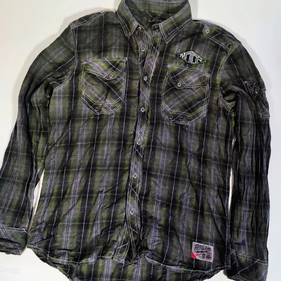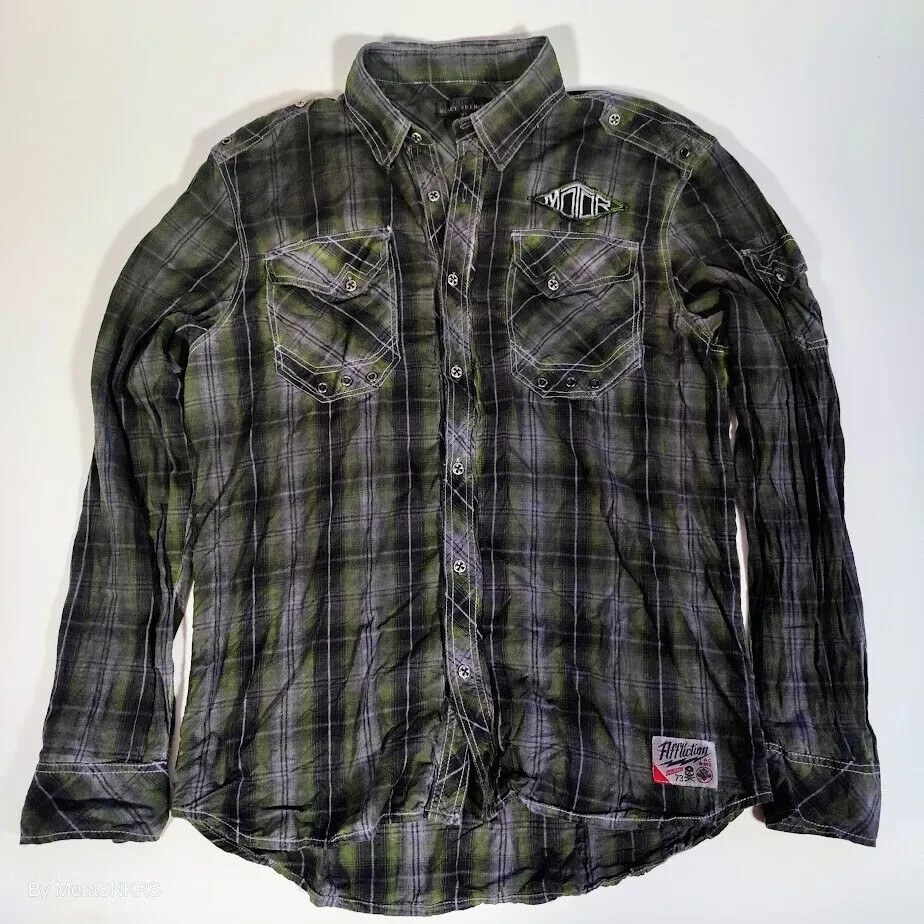 Affliction Premium Button Up Shirt Mens XL Plaid Black Green/Grey Lifestyle Used