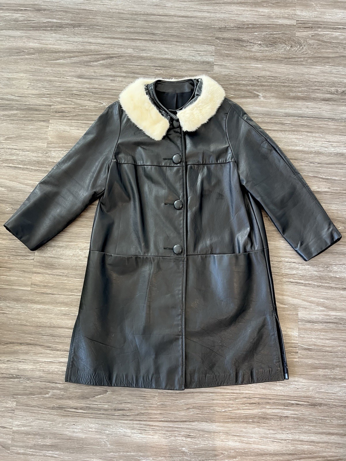 Vintage 1960s Mod Coat Black Leather Mink Collar Swing Trapeze 60s Fall Medium