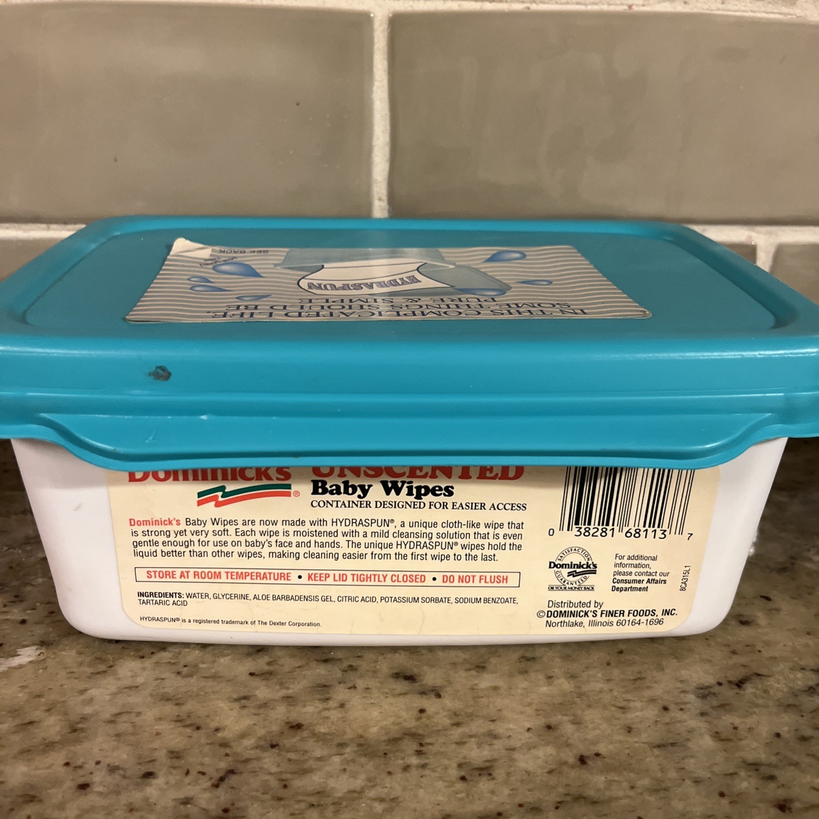 как выглядит Vintage Dominicks Wipes Empty Tub 80 Baby Wipes Unscented Empty Prop фото