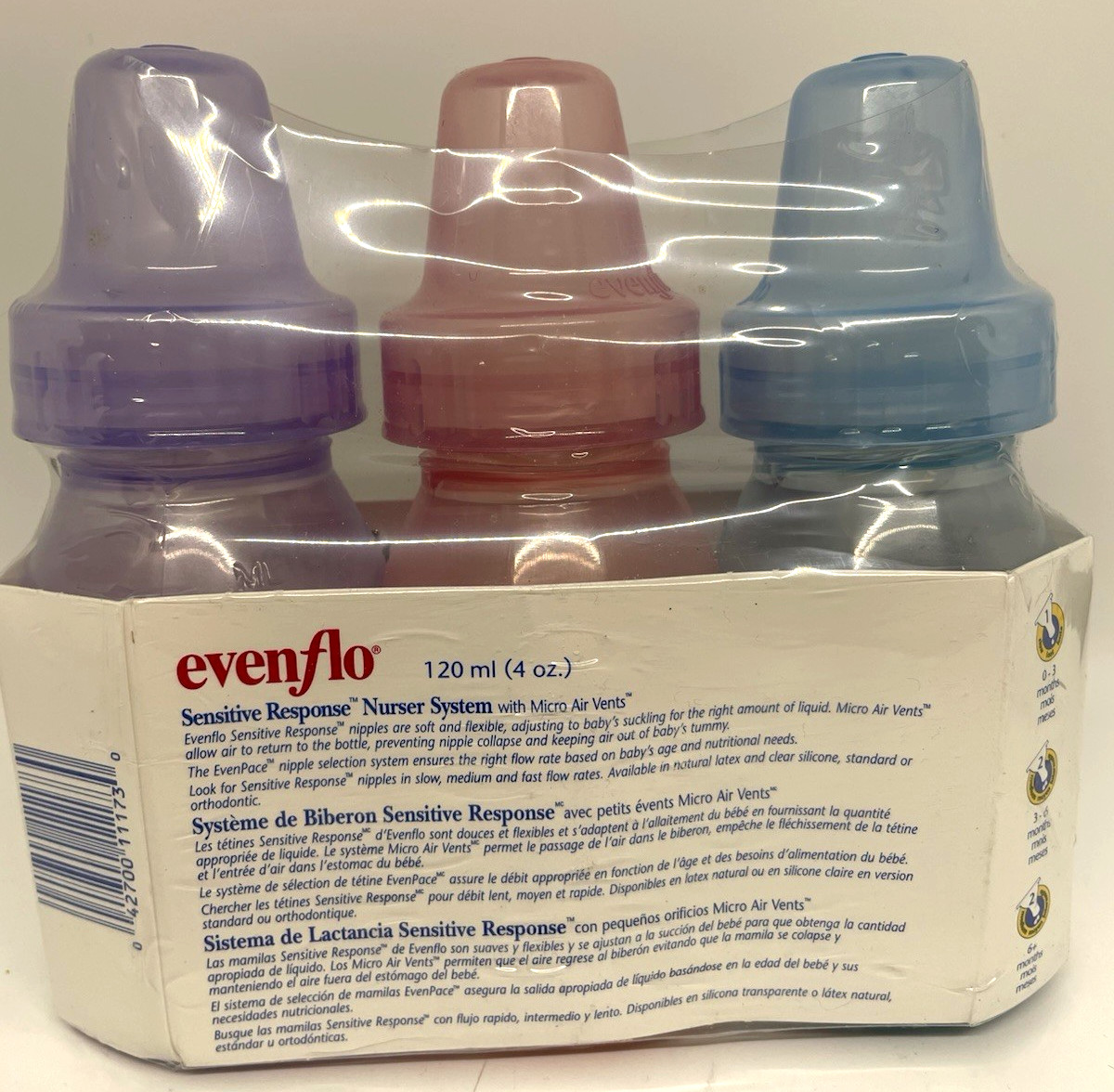 как выглядит Evenflo Classic Baby Bottles 3 pack Multicolor sensitive 4oz VTG Vintage 2000 фото