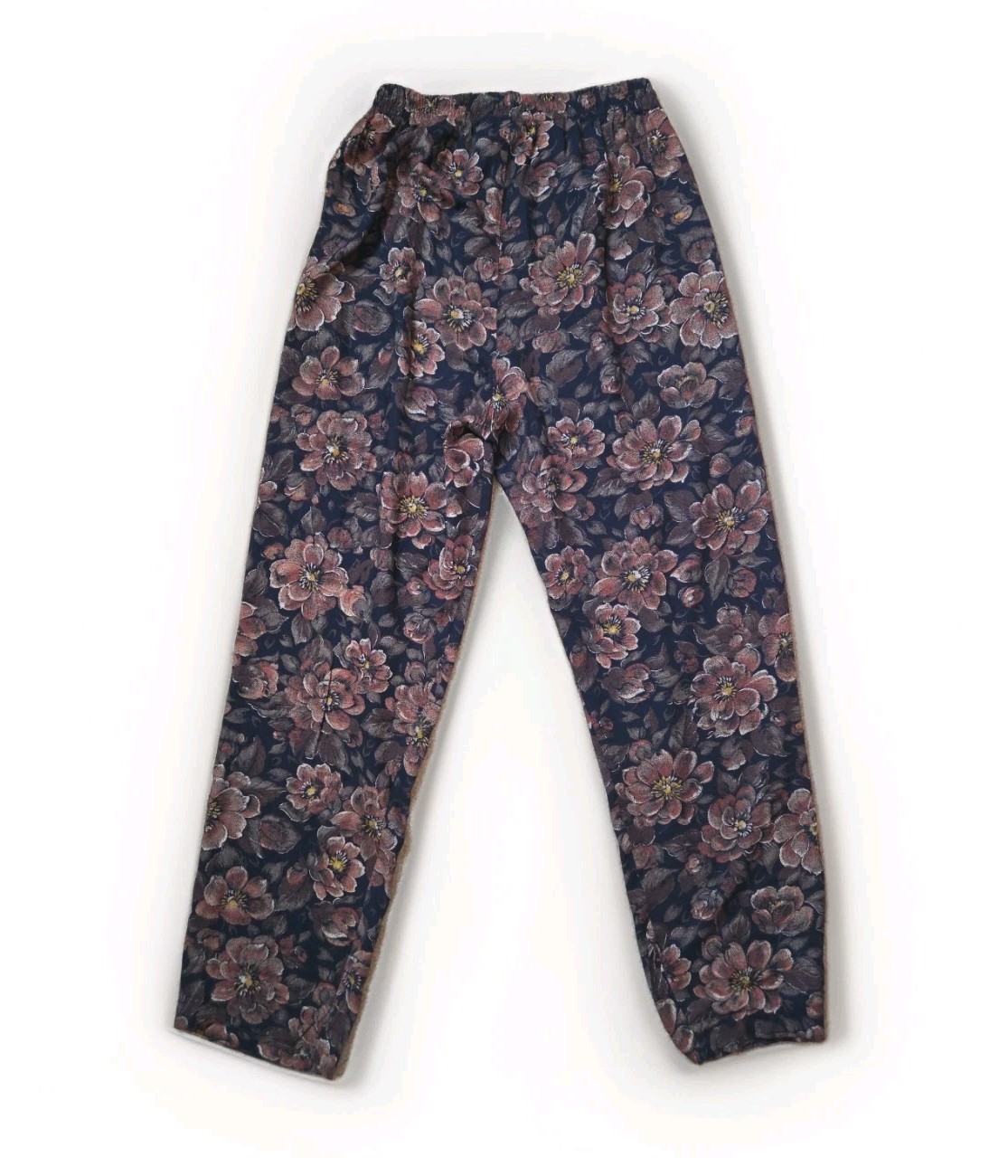 Women Vintage High Rise Pleated Trouser Pants Rayon Floral Navy Blue Medium