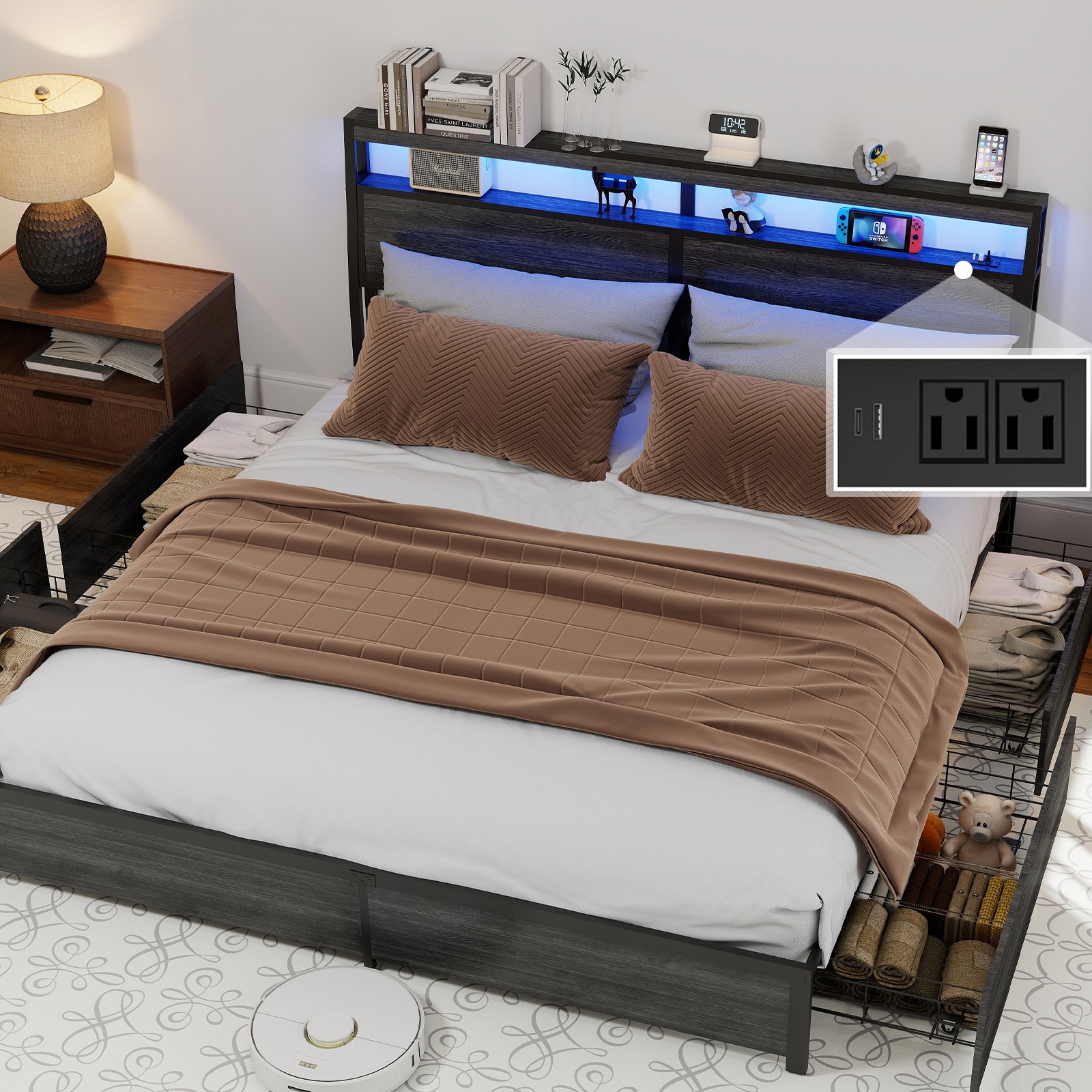 Bed Frame with LED Lighted Headboard and 4 Storage Drawers Charging Station