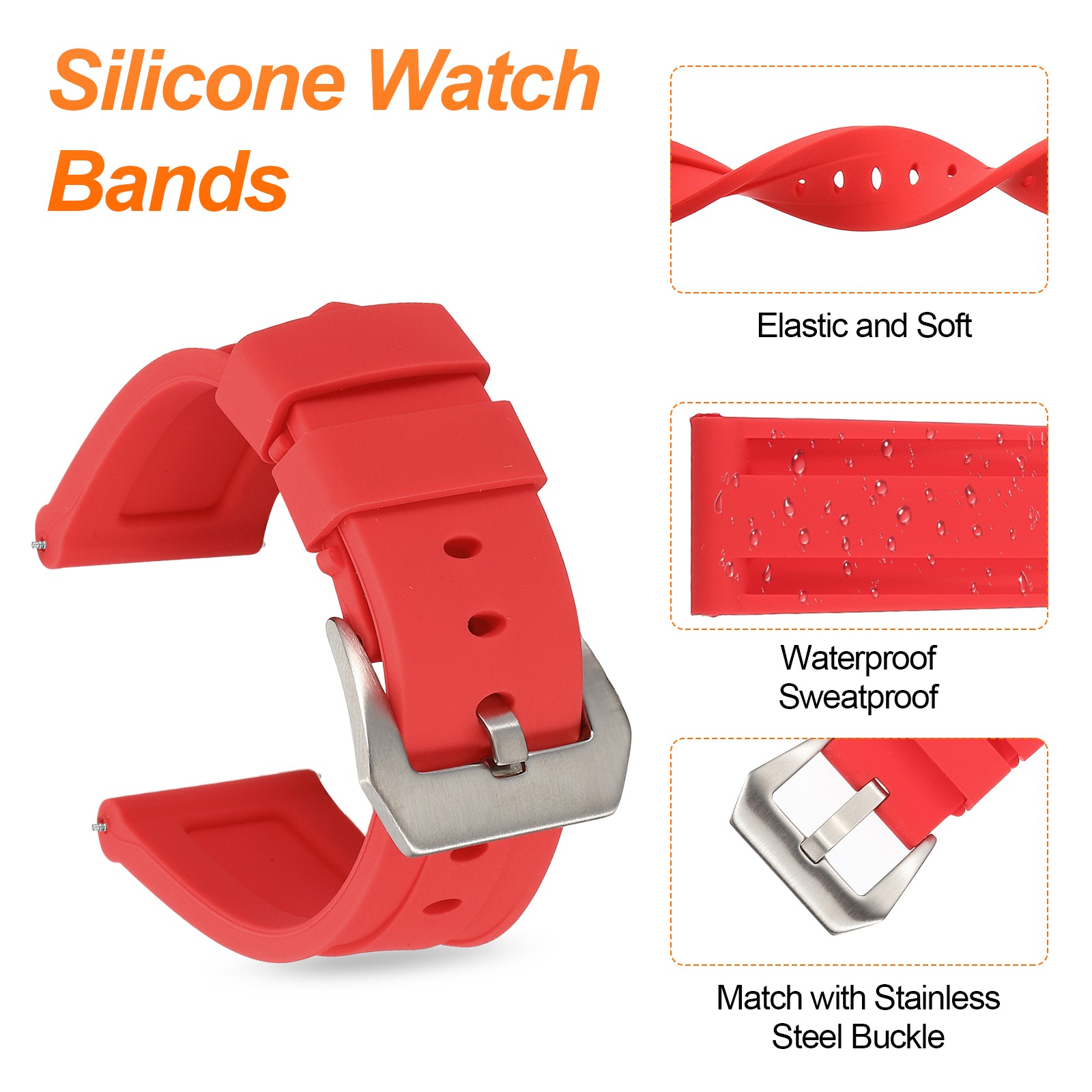 Silicone Watch Bands 24mm Soft Watch Band with Silver Buckle, Red