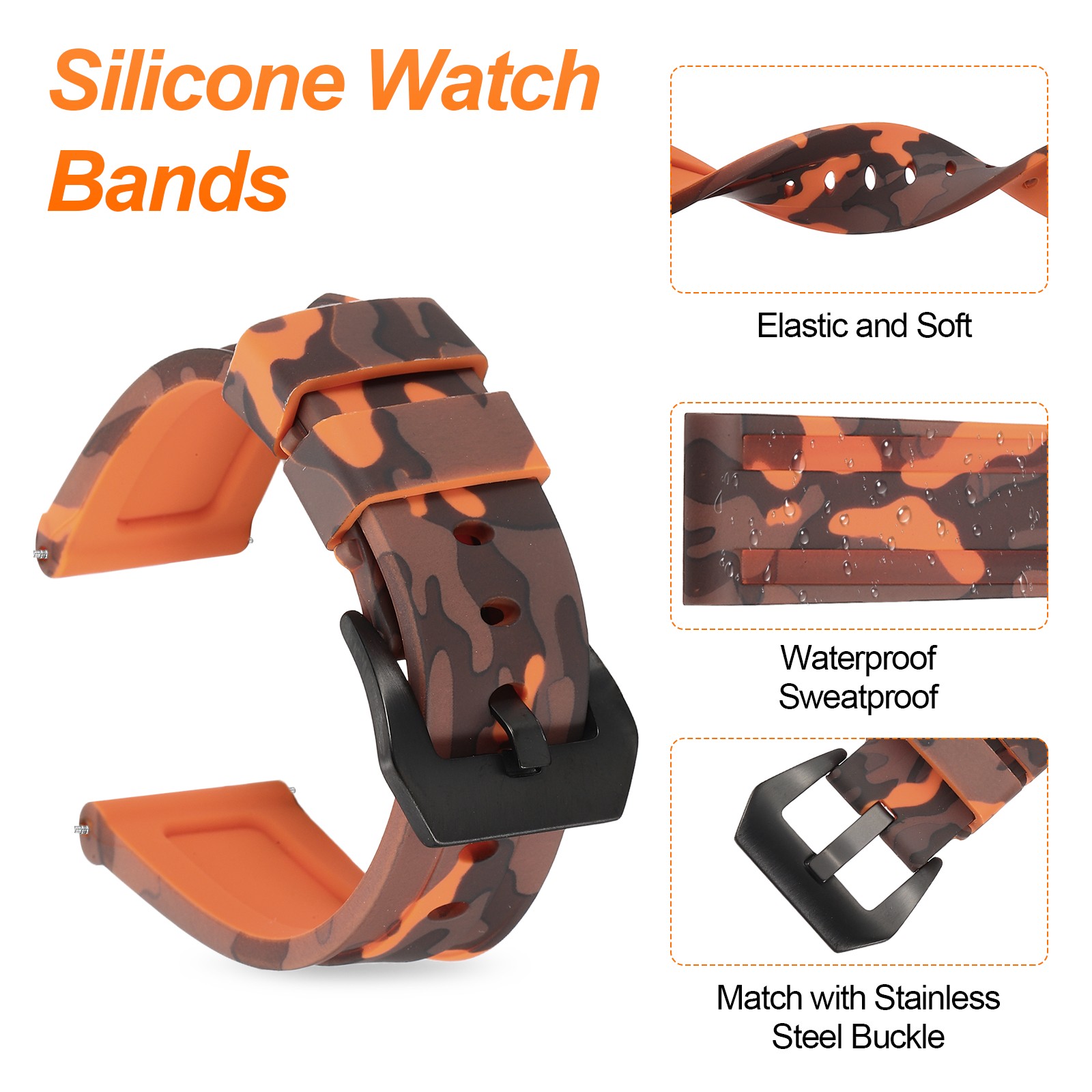 Silicone Watch Bands 22mm Soft Watch Band with Black Buckle, Camo Orange