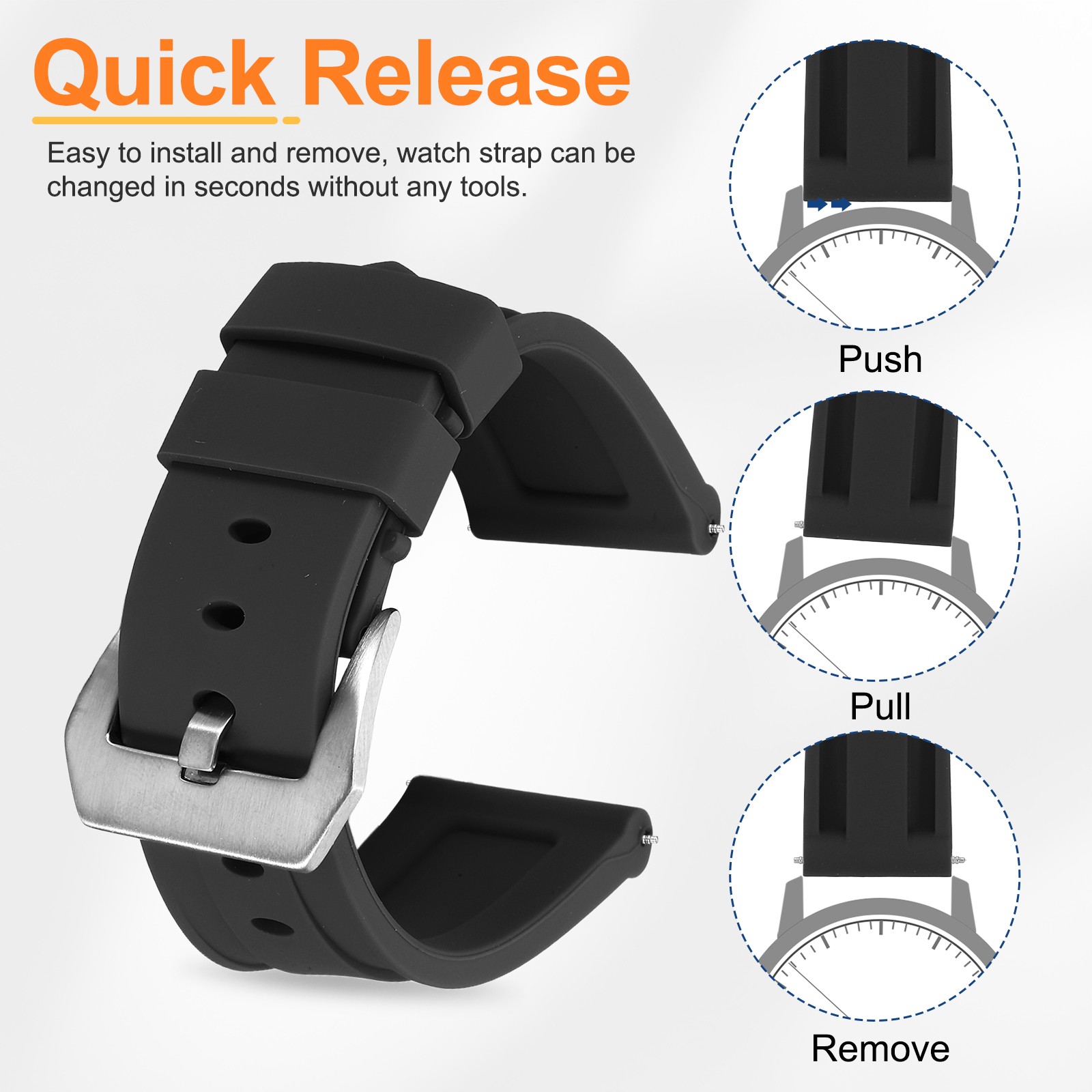 Silicone Watch Bands 24mm Soft Watch Band with Silver Buckle, Black