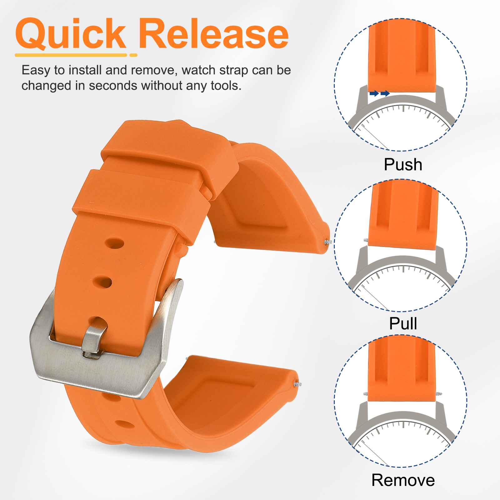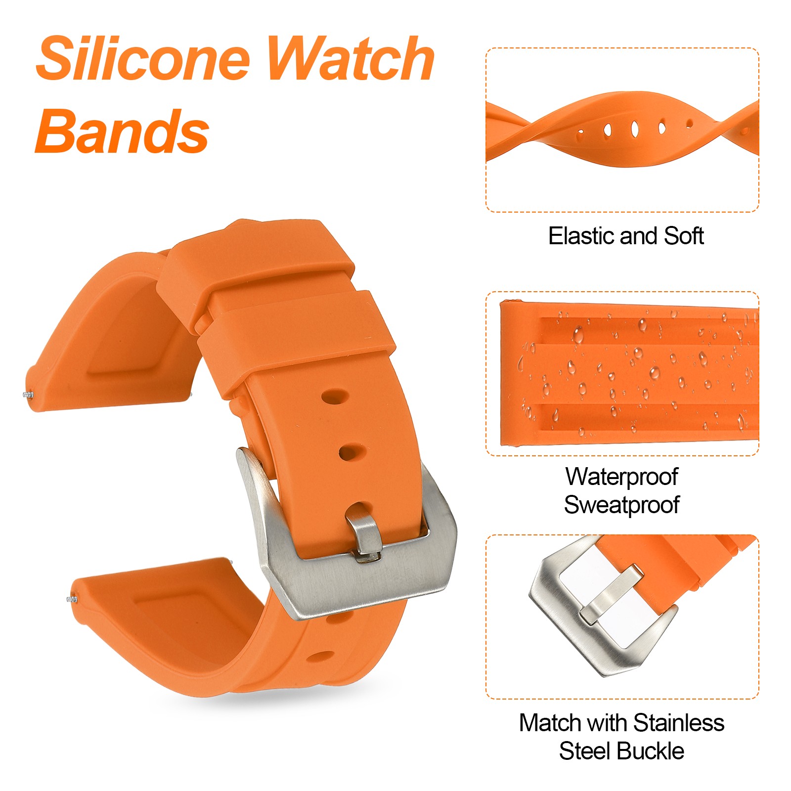 Silicone Watch Bands 24mm Soft Watch Band with Silver Buckle, Orange