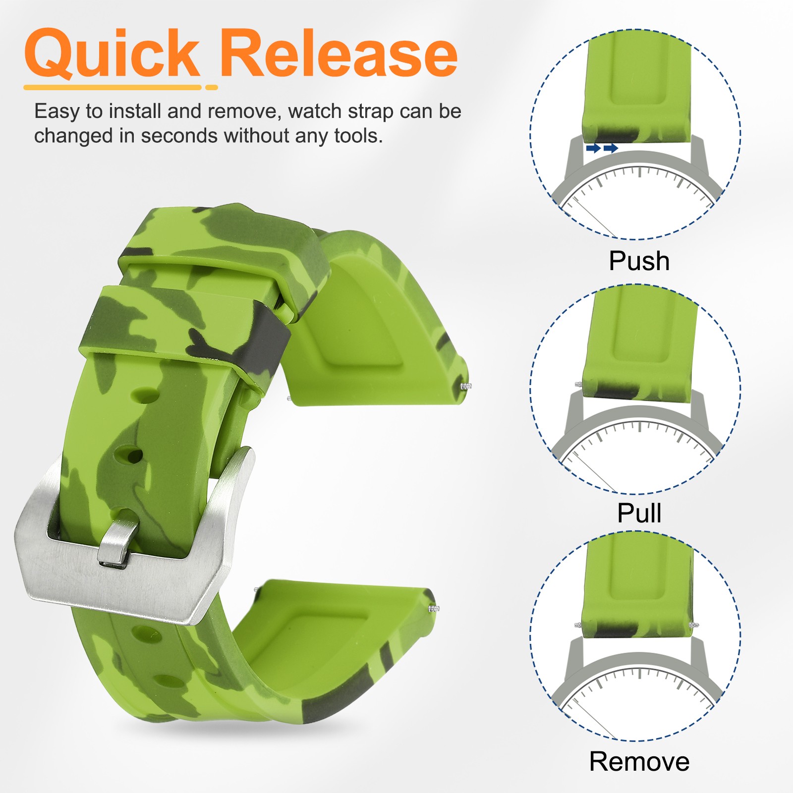 Silicone Watch Bands 24mm Soft Watch Band with Silver Buckle, Camo Light Green