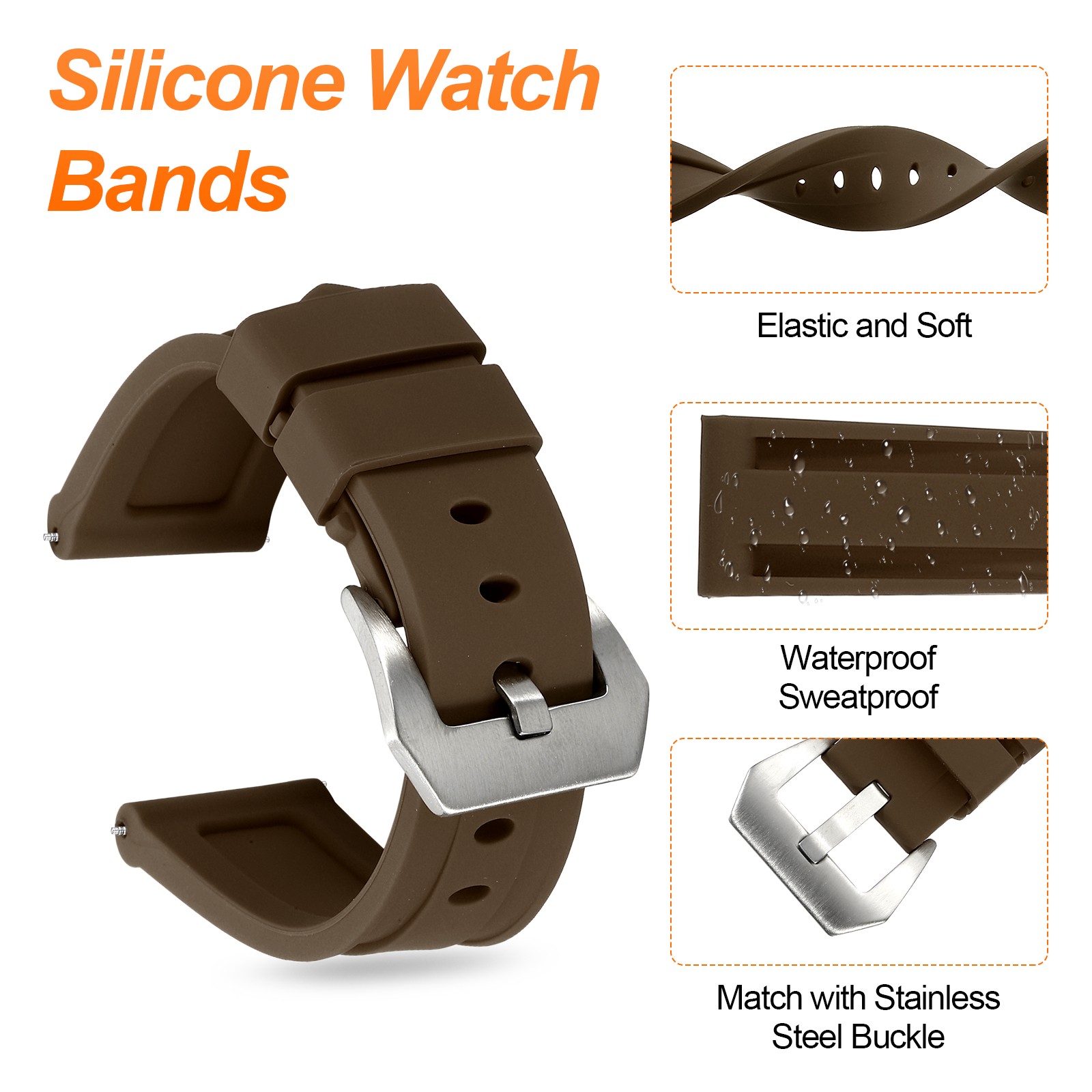 Silicone Watch Bands 22mm Soft Watch Band with Silver Buckle, Brown
