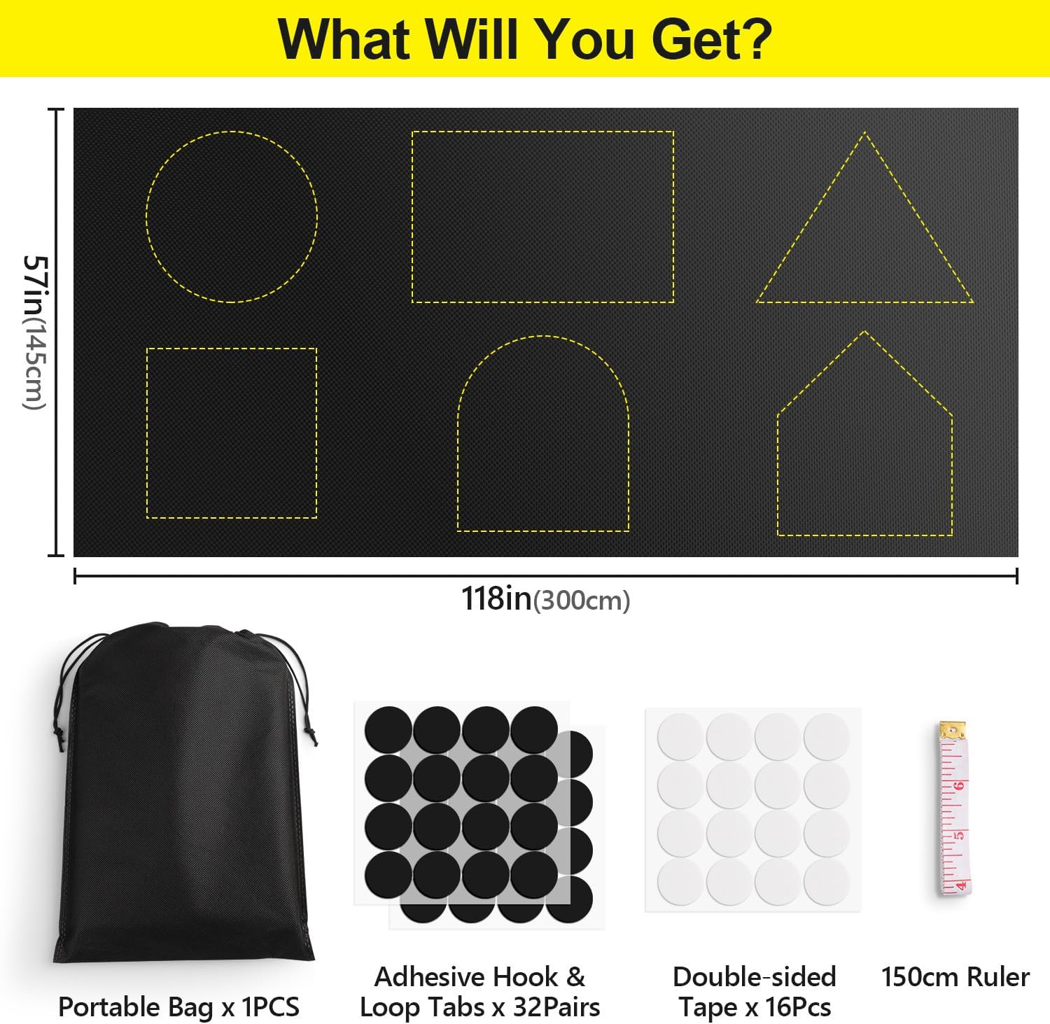 Included Components: 118" x 57" Blackout Panel(1-Pack), 150cm Ruler, Adhesive Hook & L